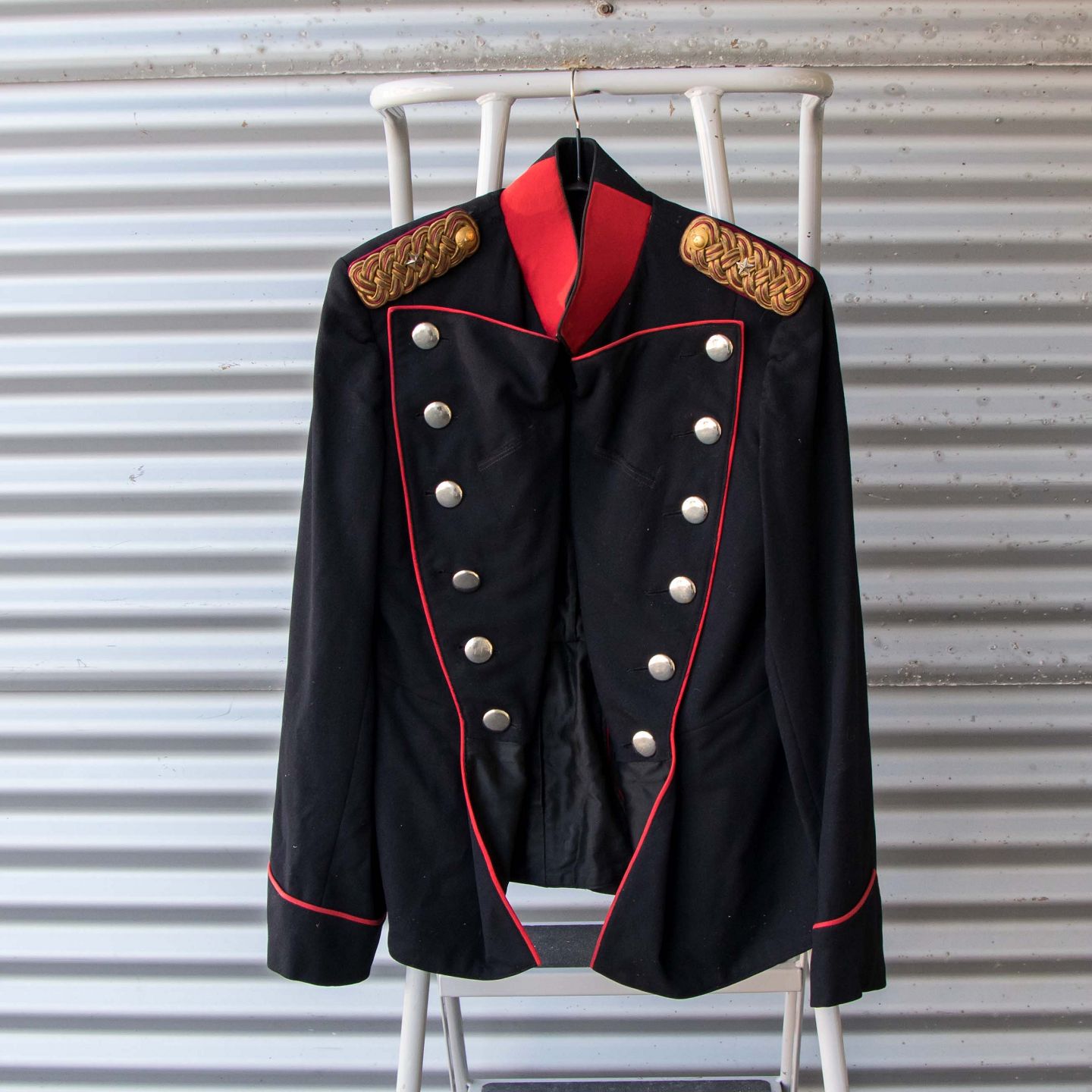 Antik uniform i sort stof fra Bornholms Værn artelleri kompagni