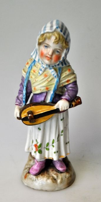 Antik håndbemalet porcelæns figur af pige med hurdy - gurdy, Elbogen, 19. årh. Tyskland.