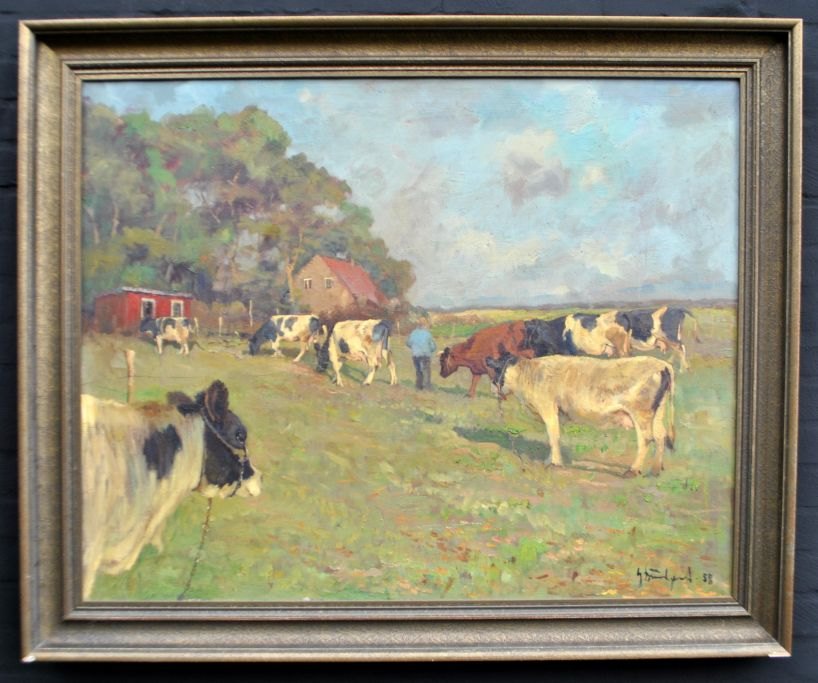 Bundgaard, Gunnar (1920 - 2005) Danmark: Landskab med køer. Olie på lærred. Signeret 58. 80 x 100 cm.