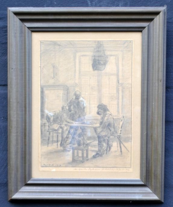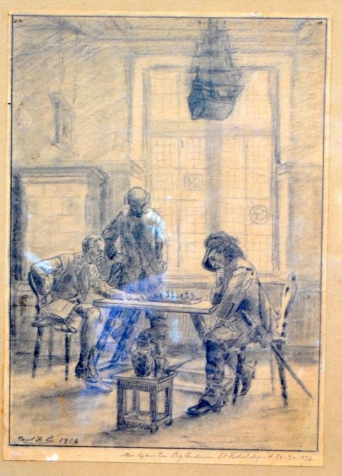 Christensen, Carl. J. (19th / 20th century) Denmark: Chest players. Drawing on paper. Signed: Carl J. C 1916. 27 x 19.5 cm.