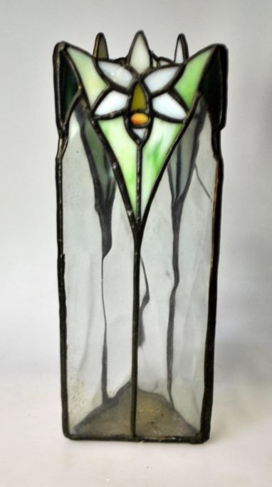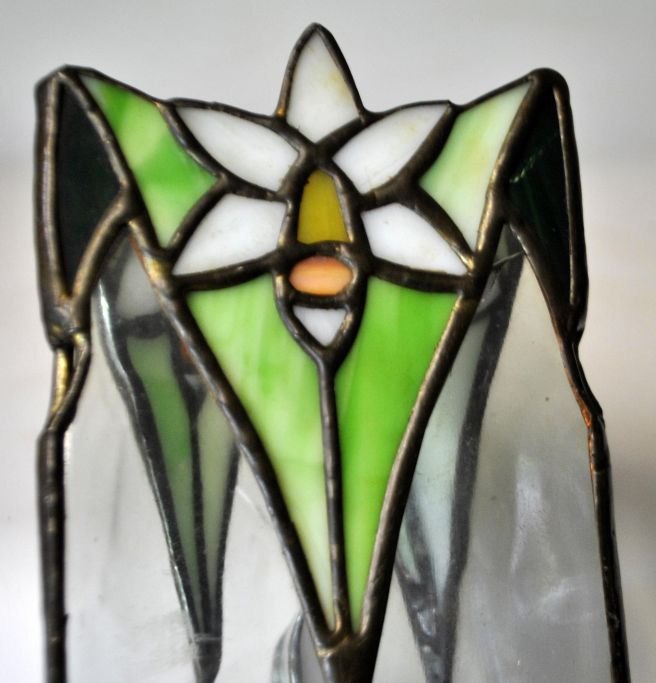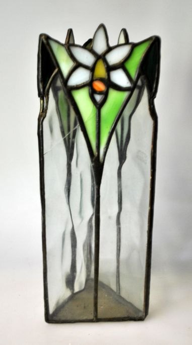 Danish Art Nouveau vase in glass, approx. 1900. Triangular. With inlaid glass in different colors. Height: 26.5 cm.