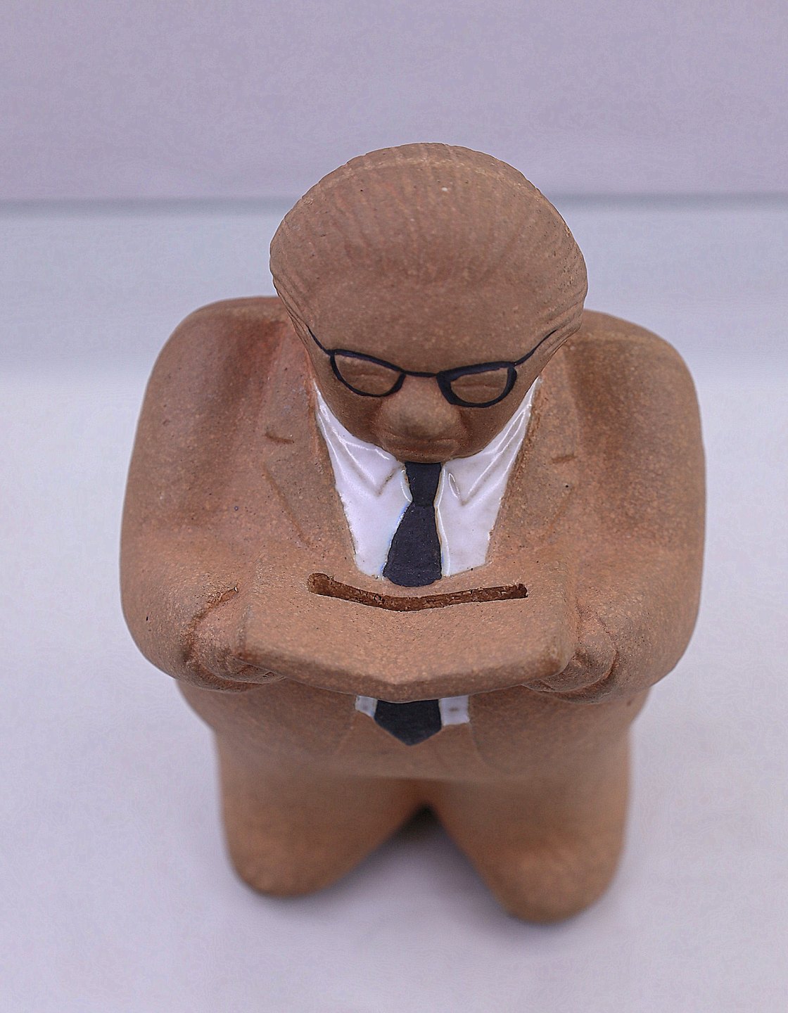 Lisa Larson for Gustavsberg. "Gunnar Sträng" er lavet som sparebøsse. "Gunnar Sträng" Var en af de store politikere, i socialdemokratiet, i 1900-tallet. Han var finansminister i over 20 år. "Gunnar Sträng" 1906-1992