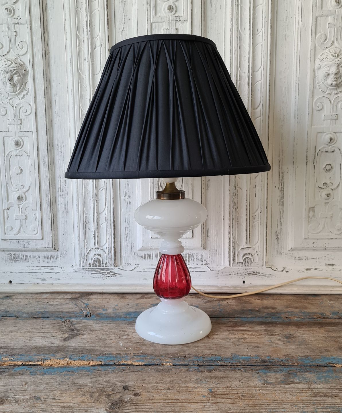 Smuk 1800 tals hvid opaline lampe med stamme i hindbærfarvet glas.