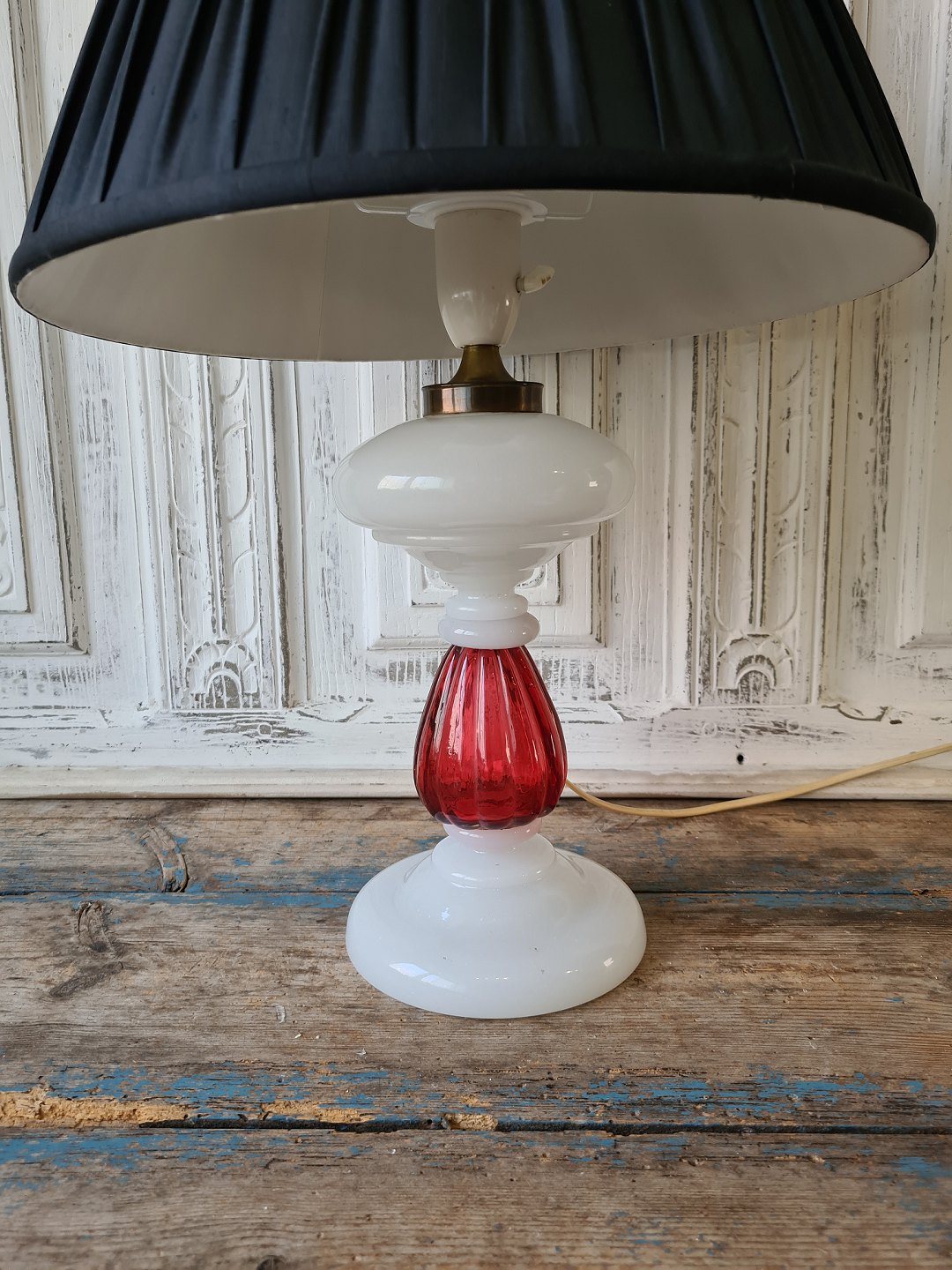 1800 tals hvid opaline lampe med stamme i hindbærfarvet glas.