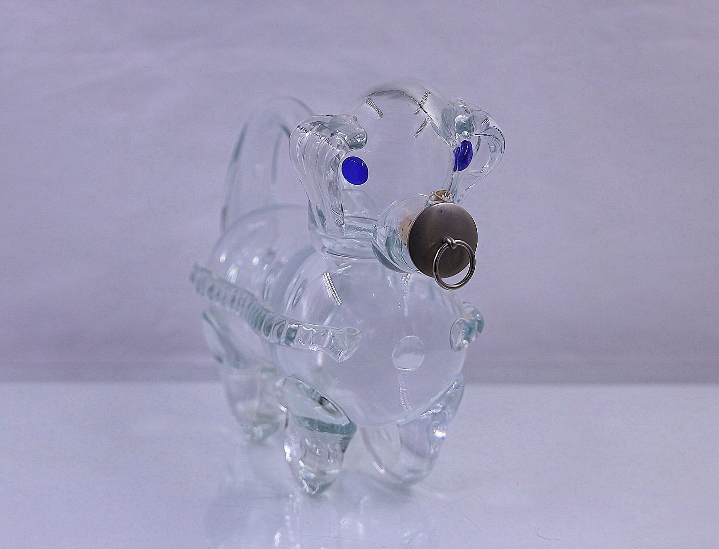 Holmegaard. Snapsehund med blå øjne og korkprop. Påsatte ører og ben. Halen, der også er påsat , fungerer som håndtag.