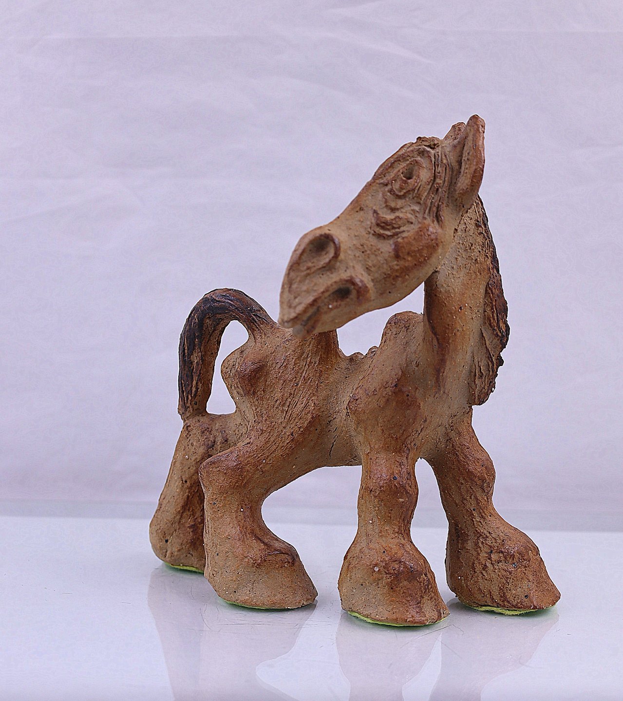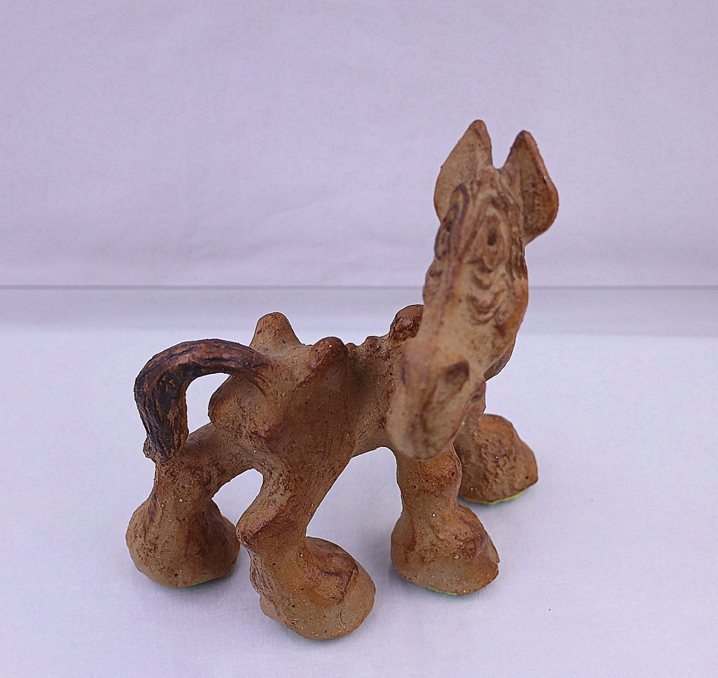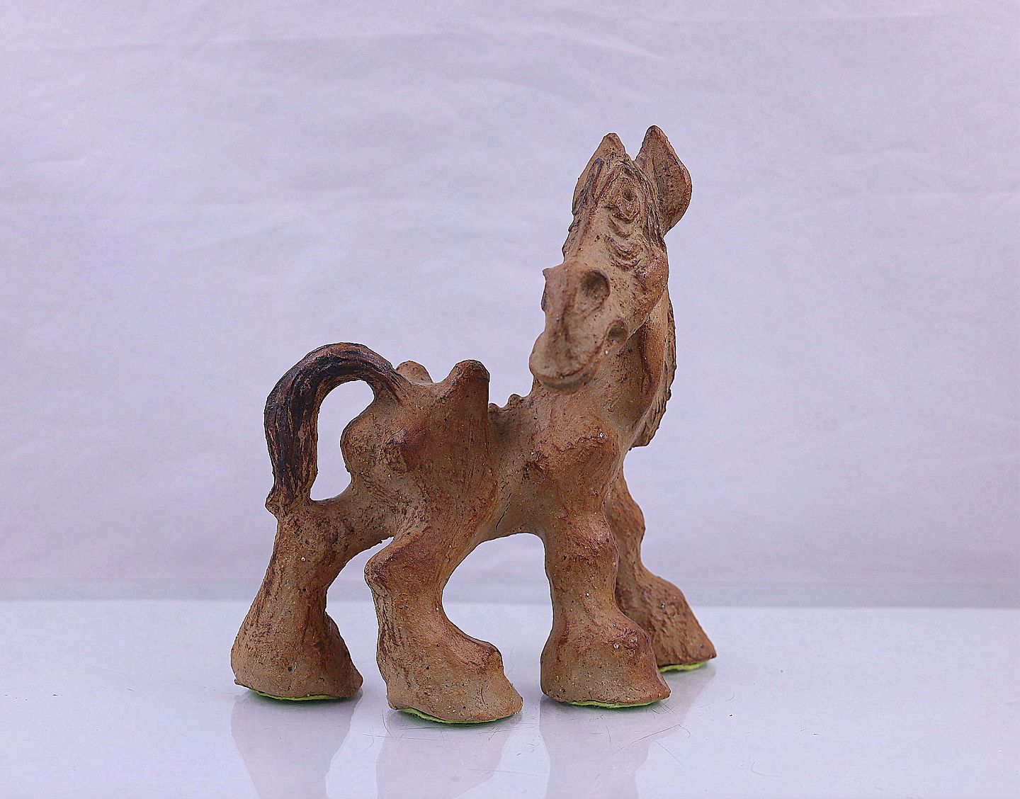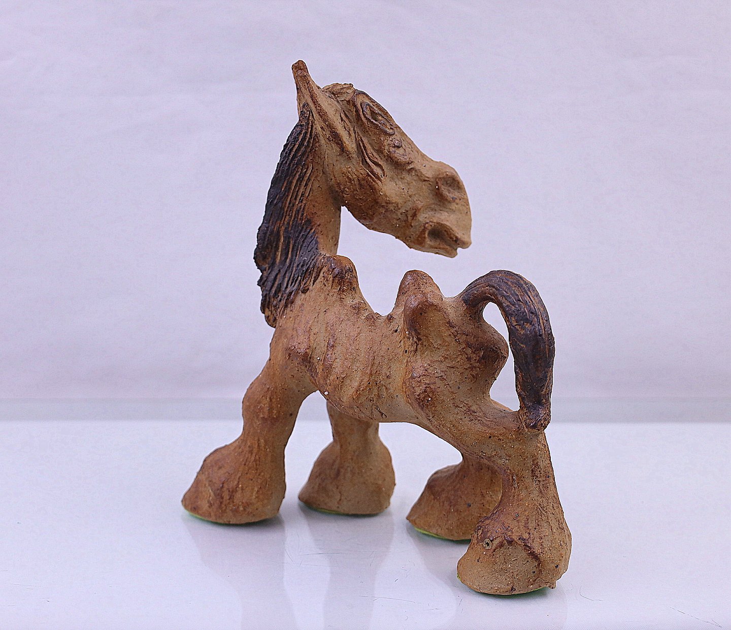 Keramik hest med store hove og en hale.
