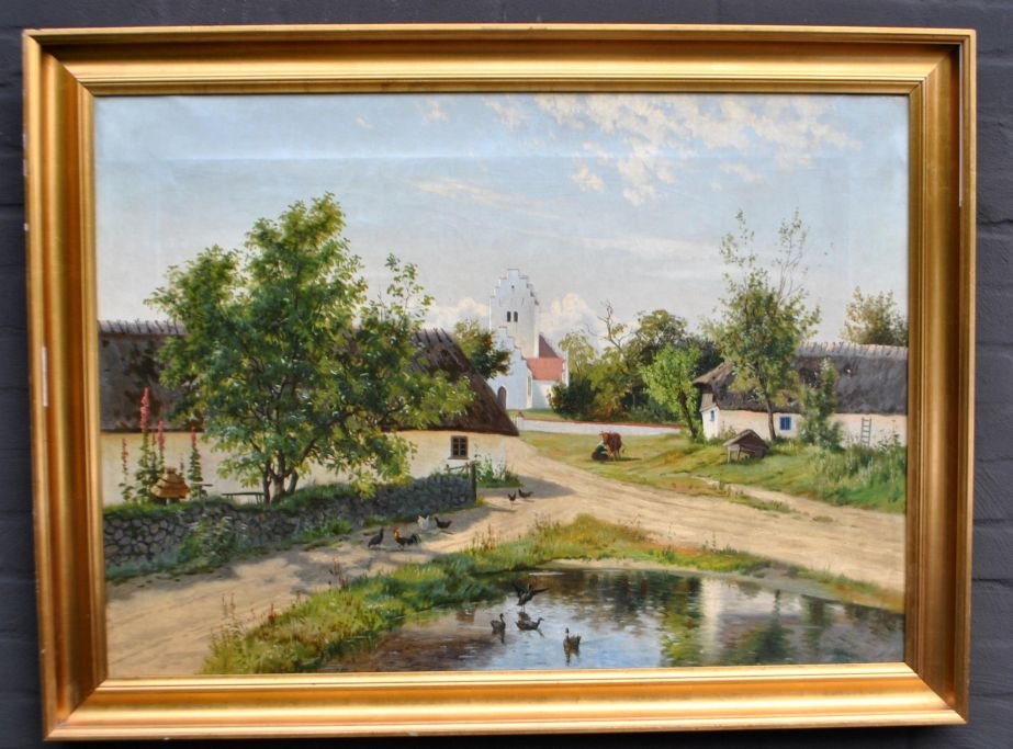Milton Jensen, Carl (1855 - 1928) Danmark: Landsby idyl. Olie på lærred. Signeret. 66 x 94 cm.