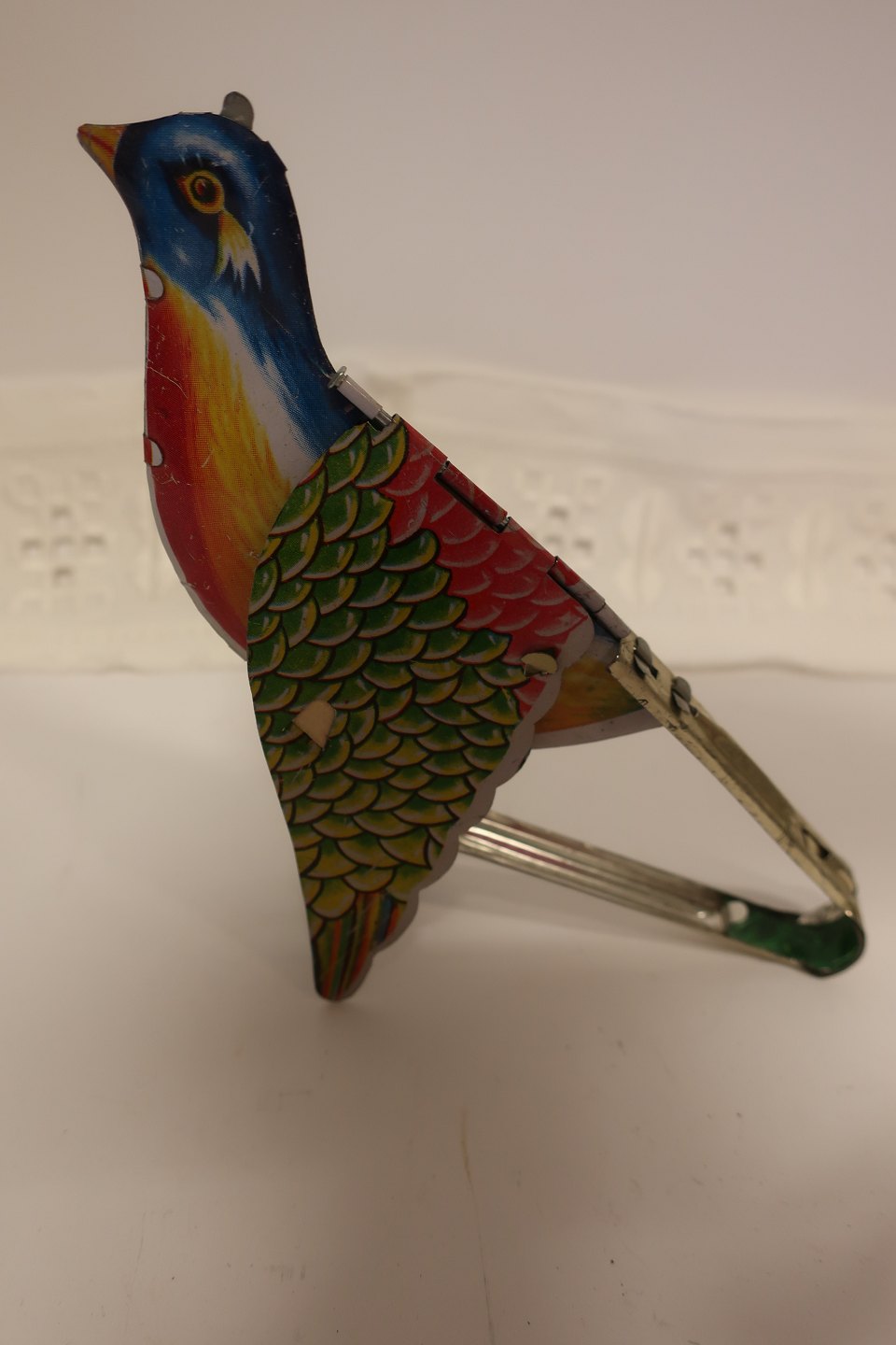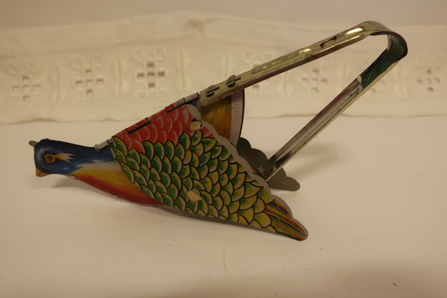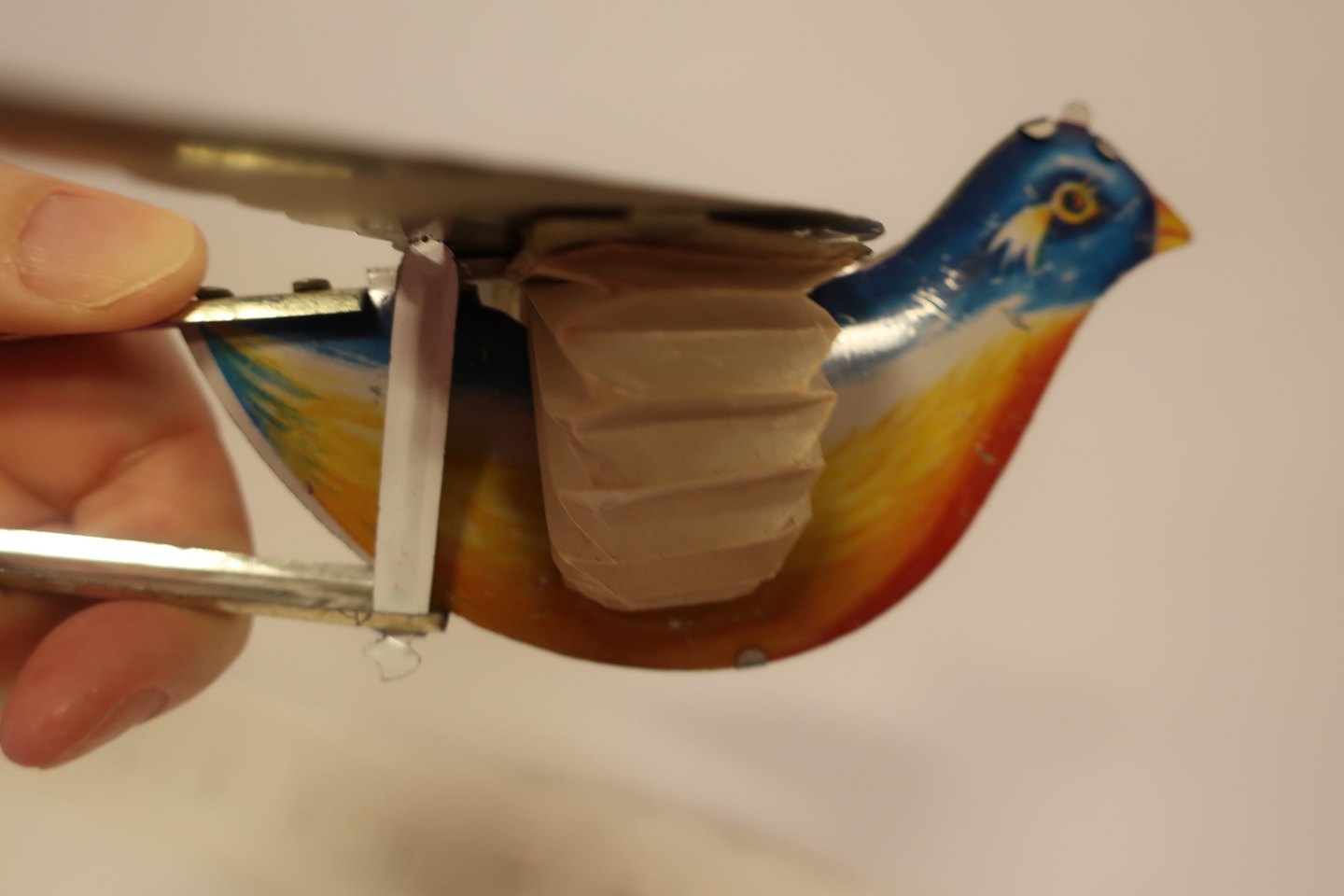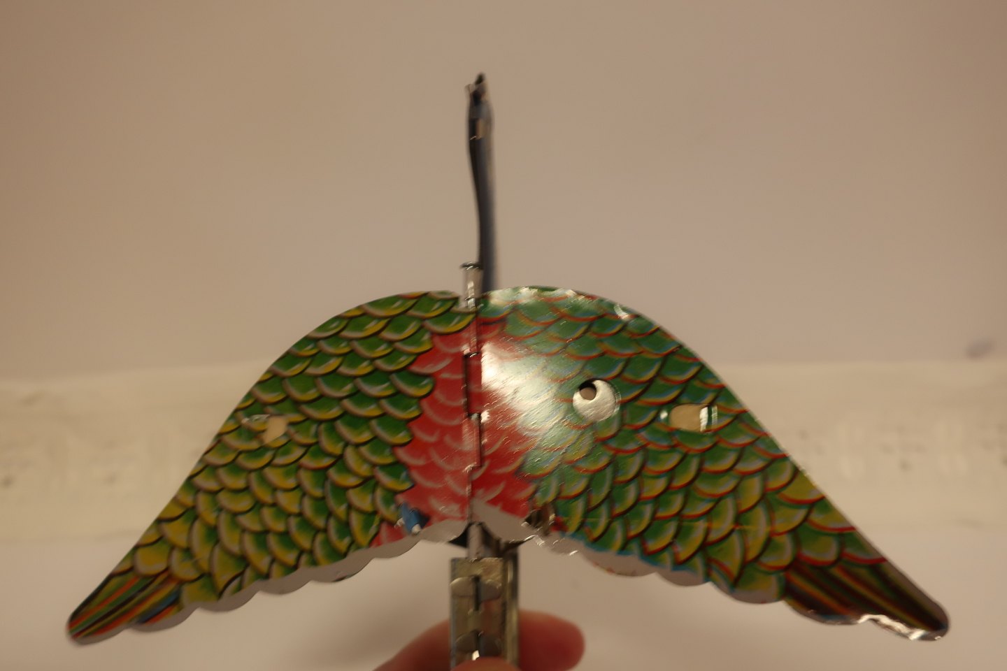 Når du trykker på metal-"gaflen" aktiveres vingerne og papegøjen "flyver"
