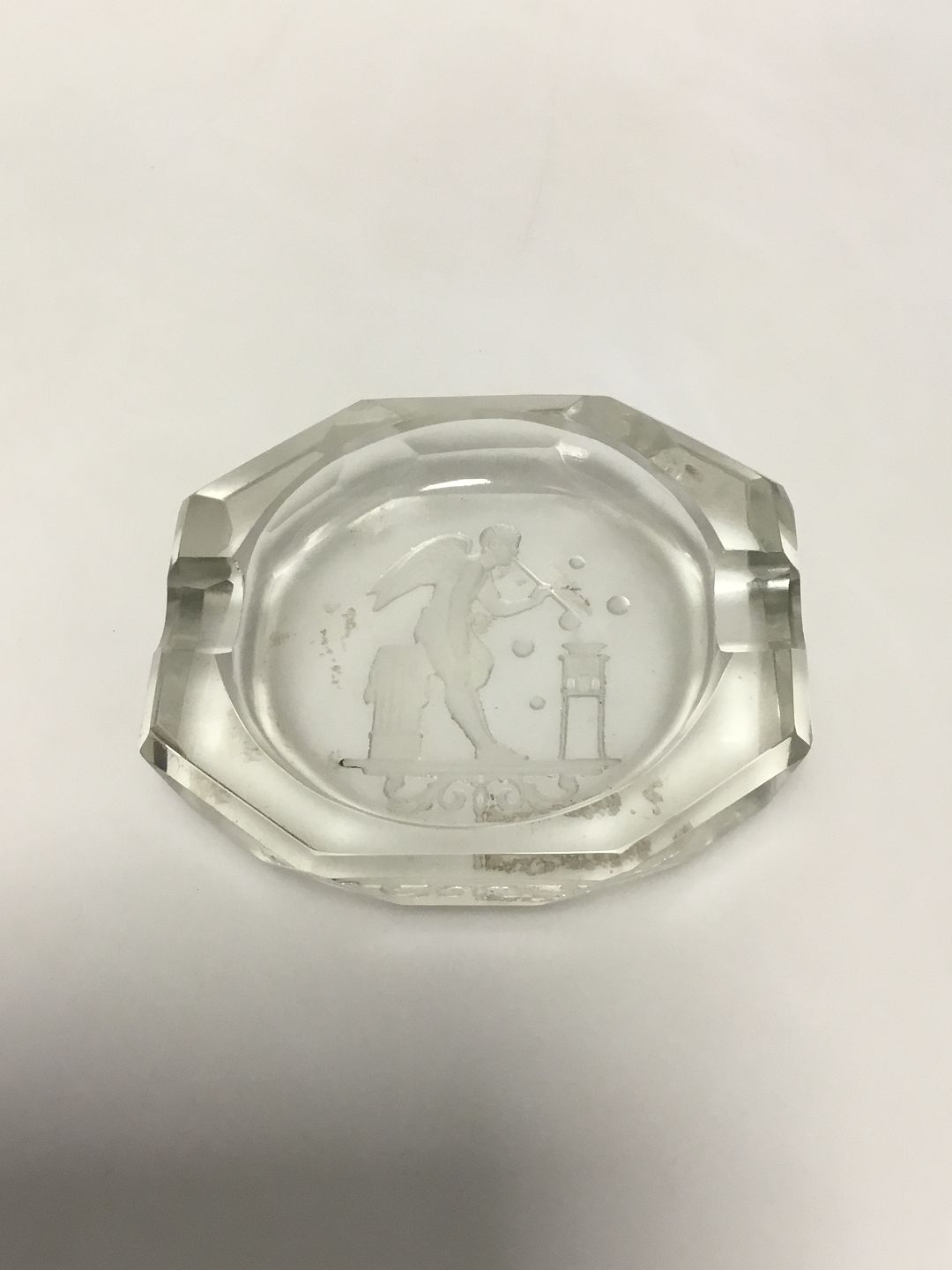 Oktagonalt Miniature askebæger i glas. Med ætset billede af engel der puster sæbebobler. L: 7,5 cm