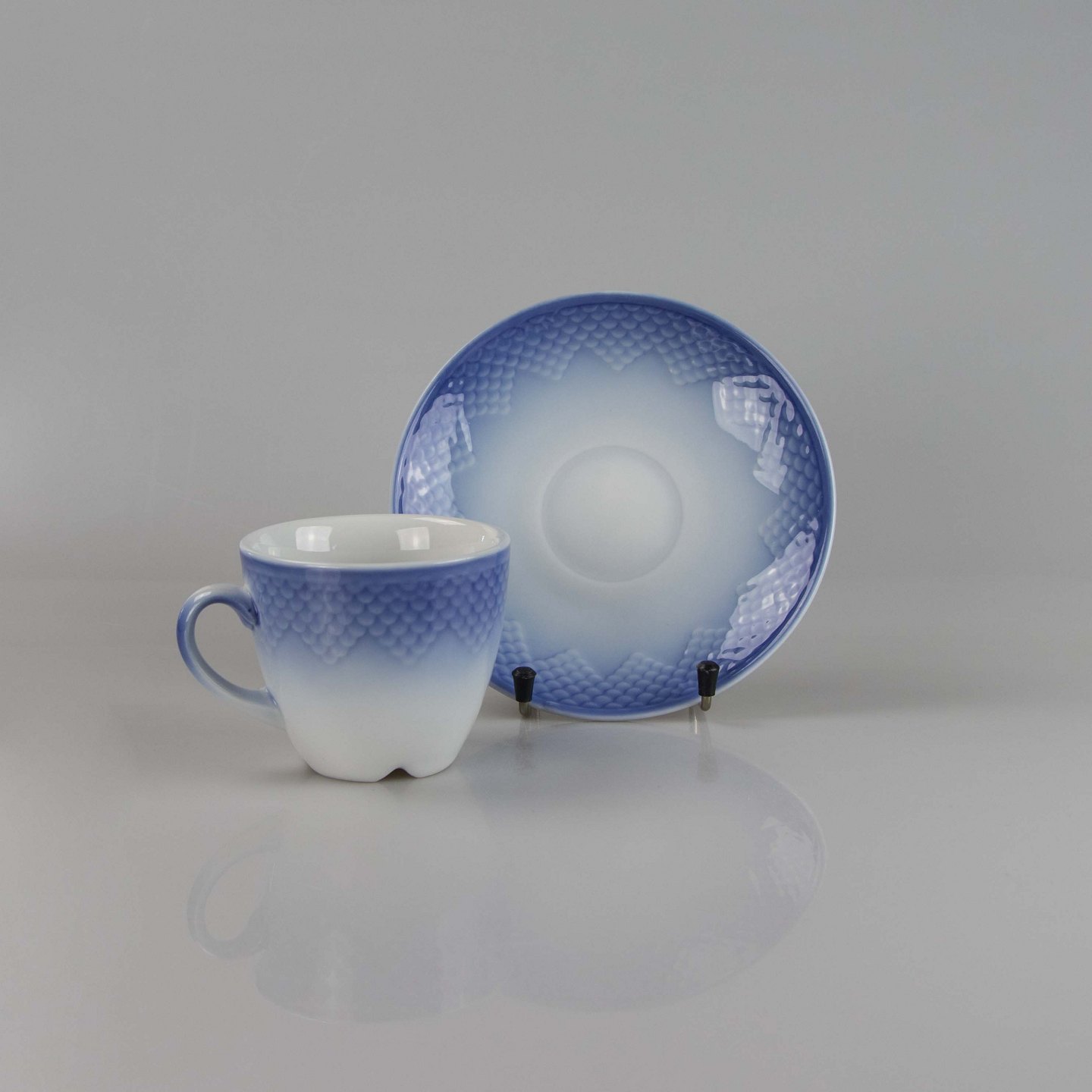 Kop fremstillet i hotelporcelæn med skelform i gradueret blå nuancer.
