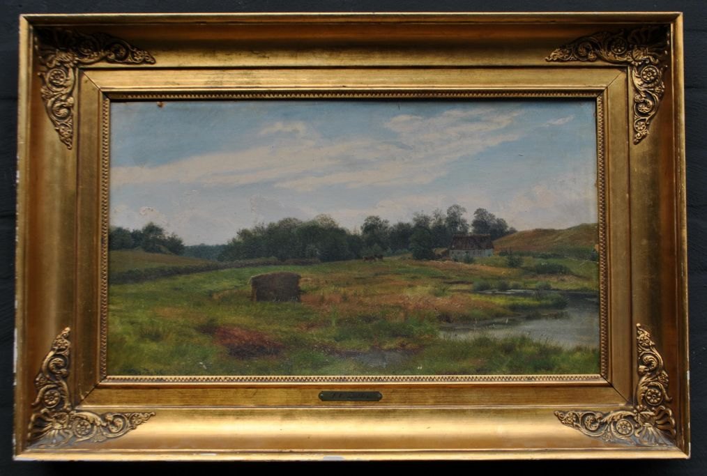 Zillen, Johan Wilhelm (1824 - 1870) Danmark: Landskab med køer på en mark ved en gård. Olie på malepap. Signeret WZ 1865.