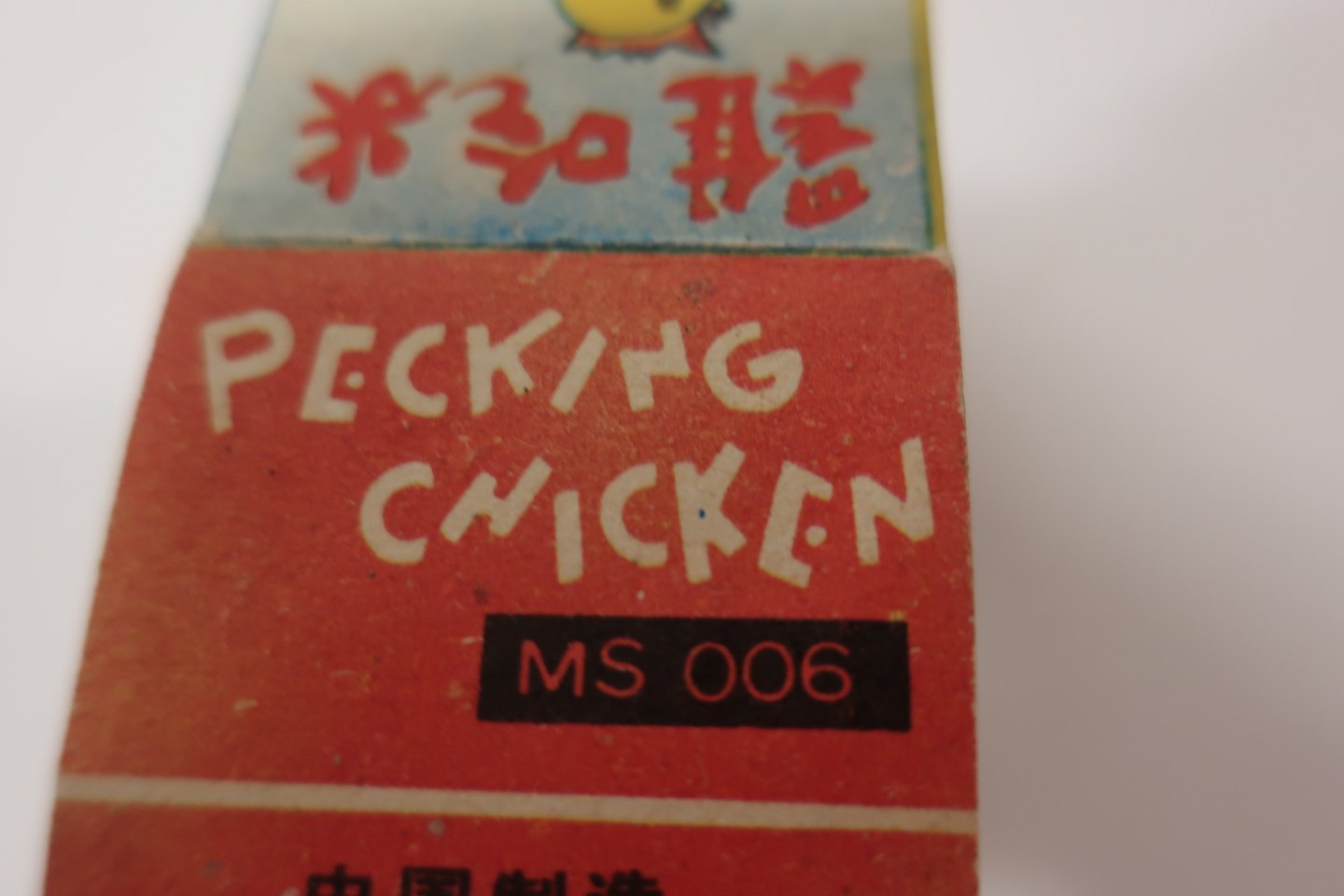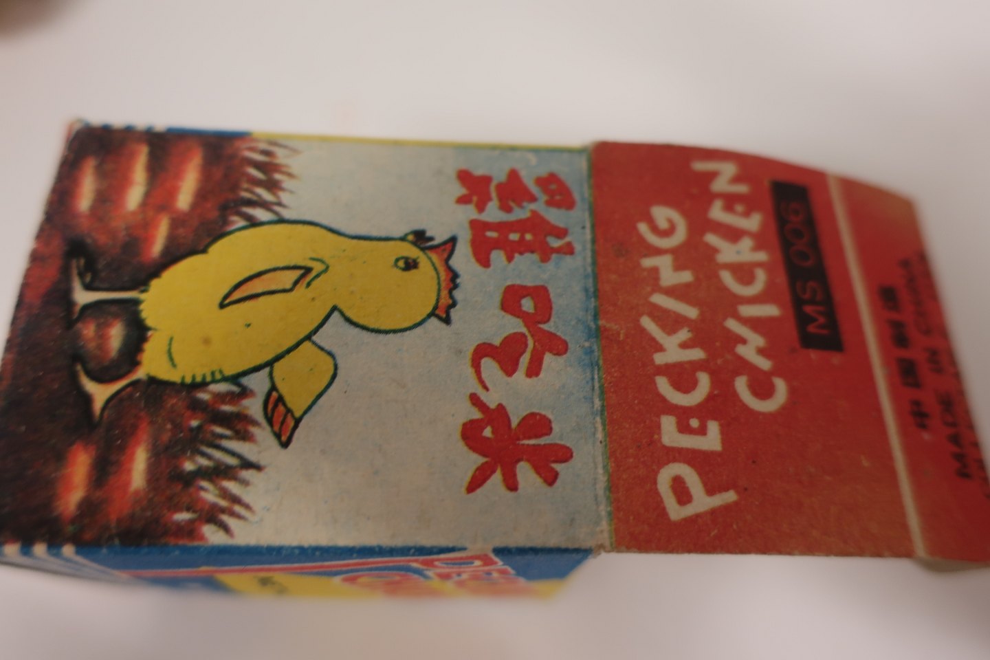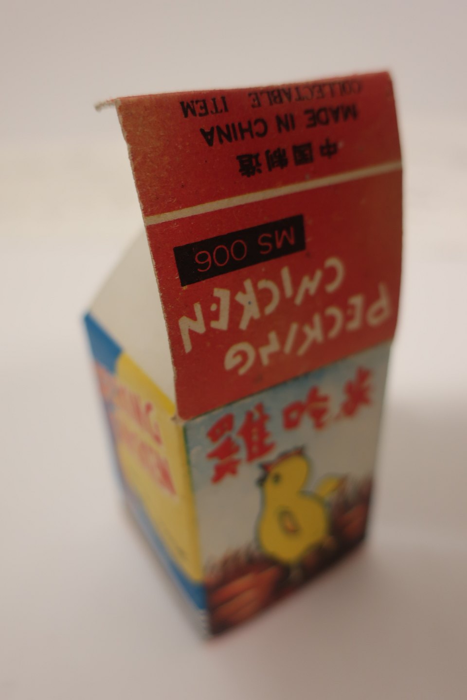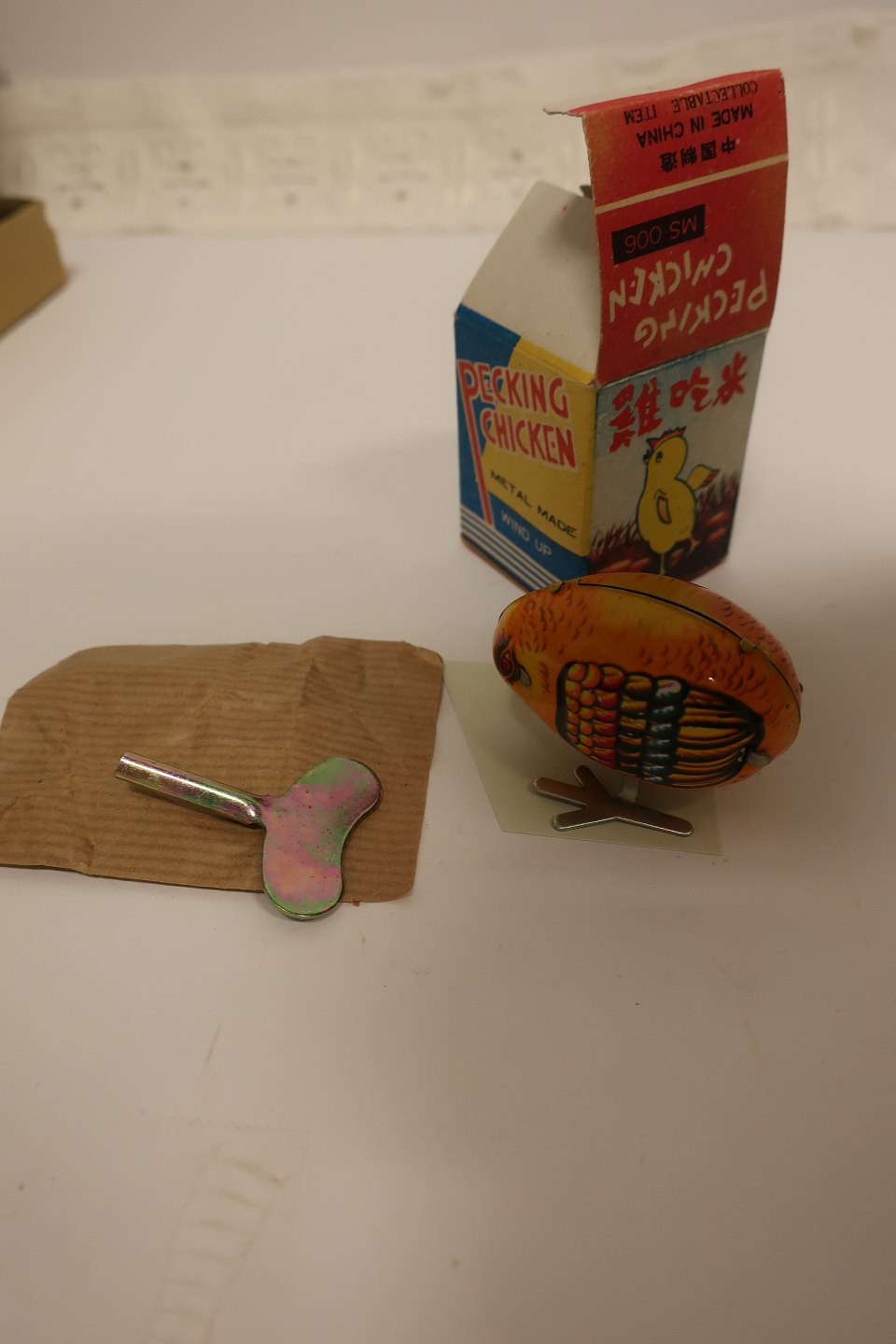 Tekst på æsken: "Pecking Chicken", "Metal Made", "Wind up", "MS 006"