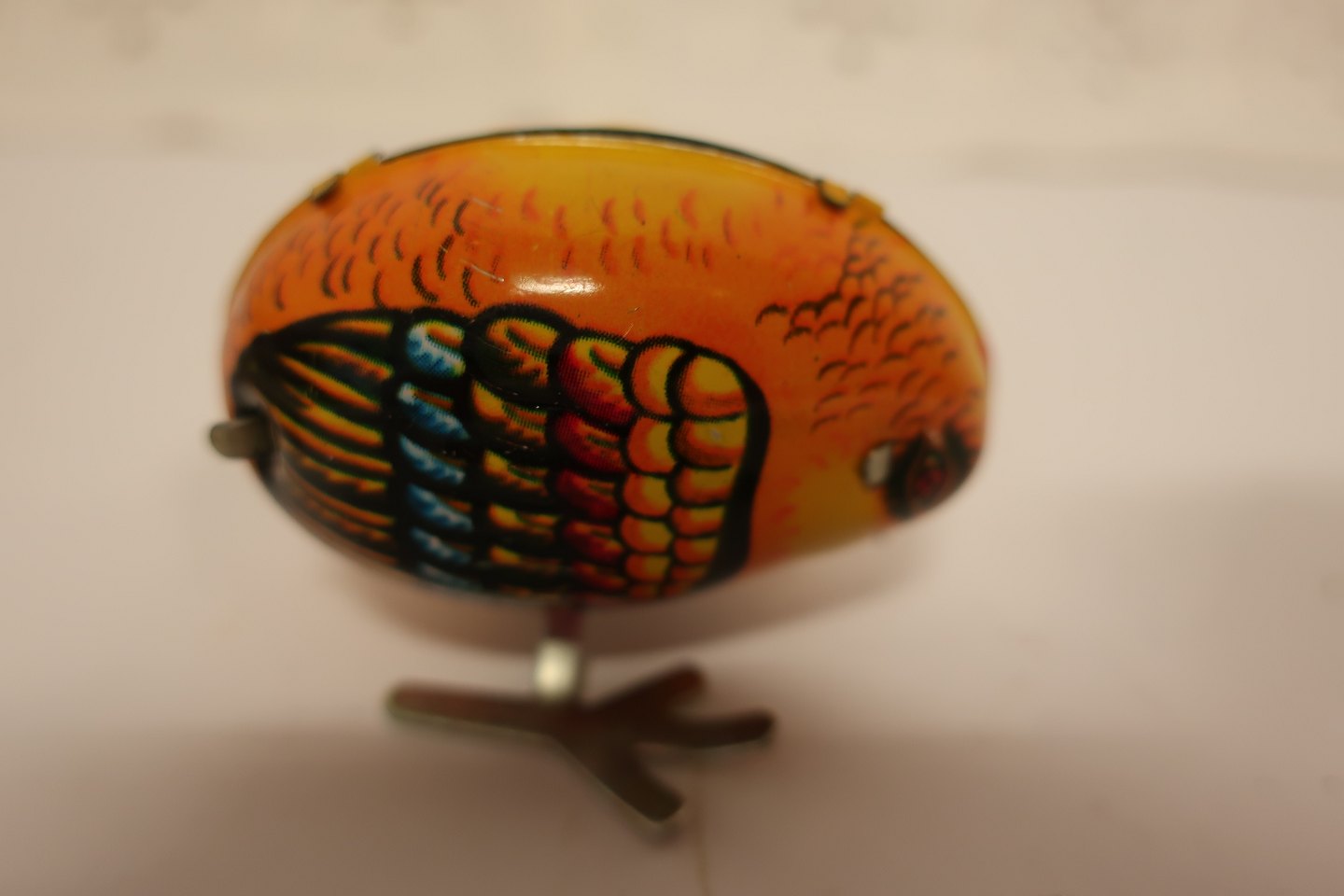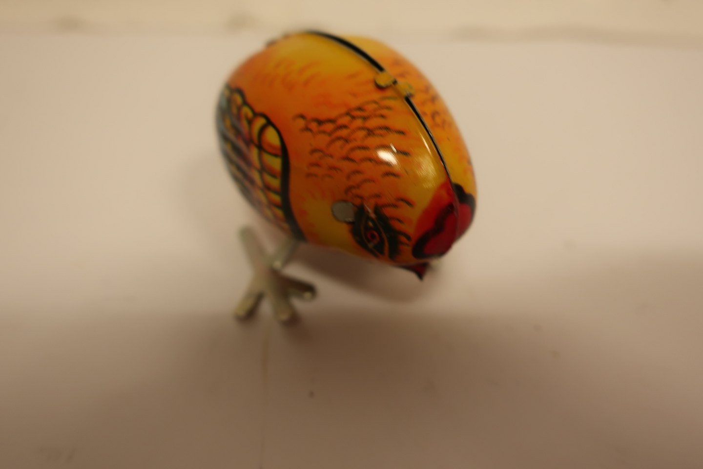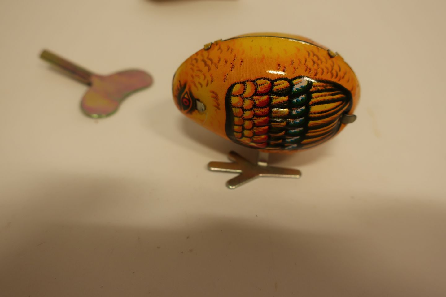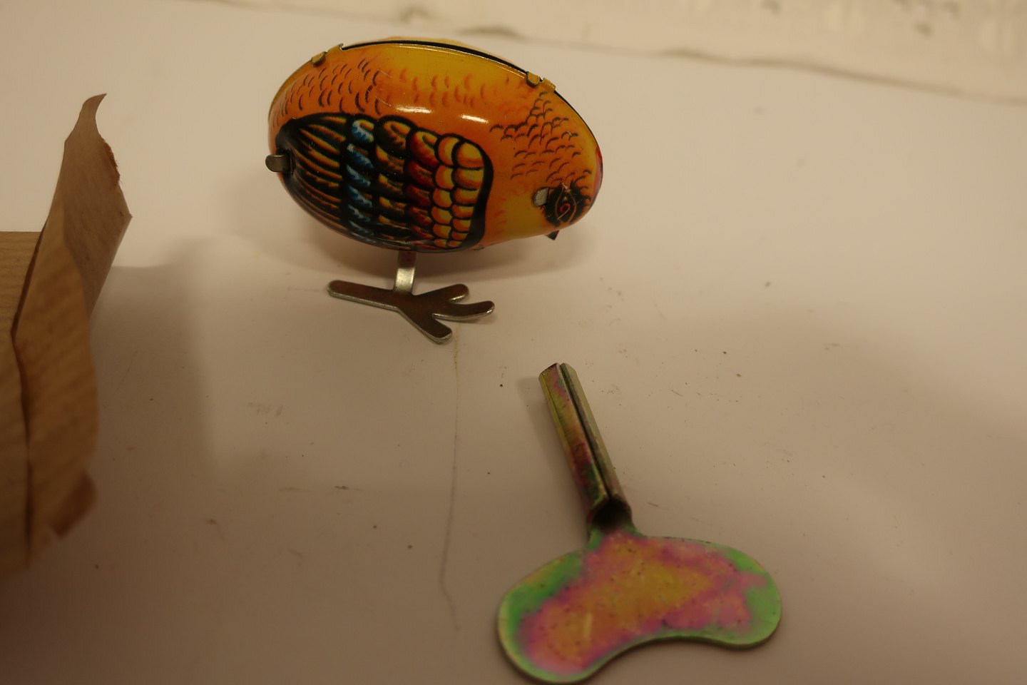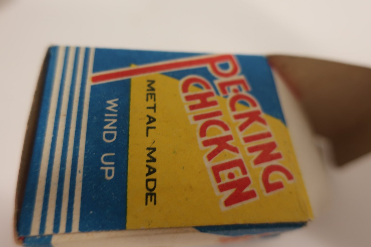 Tekst på æsken: "Pecking Chicken", "Metal Made", "Wind up", "MS 006"