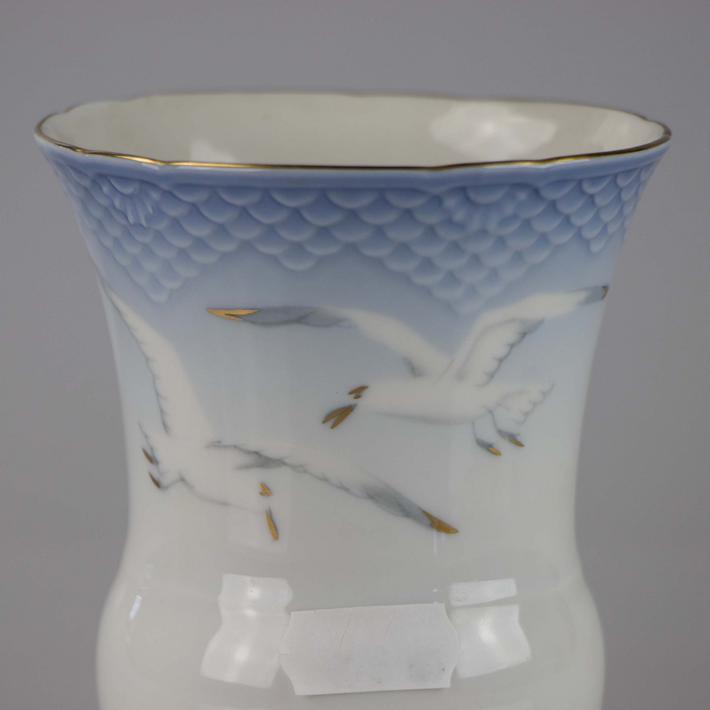 Vase fremstillet i porcelæn med skelform i gradueret blå nuancer med guldkant samt motiv af måge.