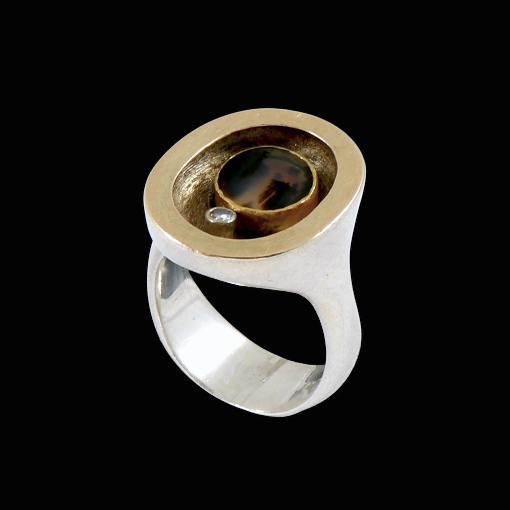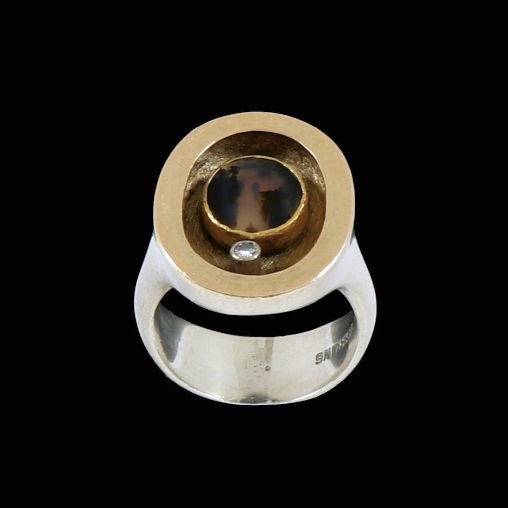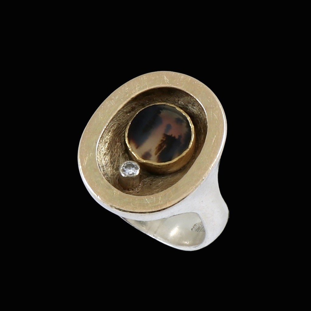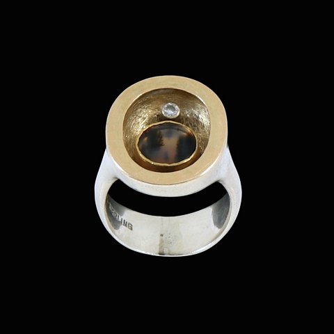 Ole Waldemar Jacobsen. Ring i Sterling sølv med guld mosagat og diamant.