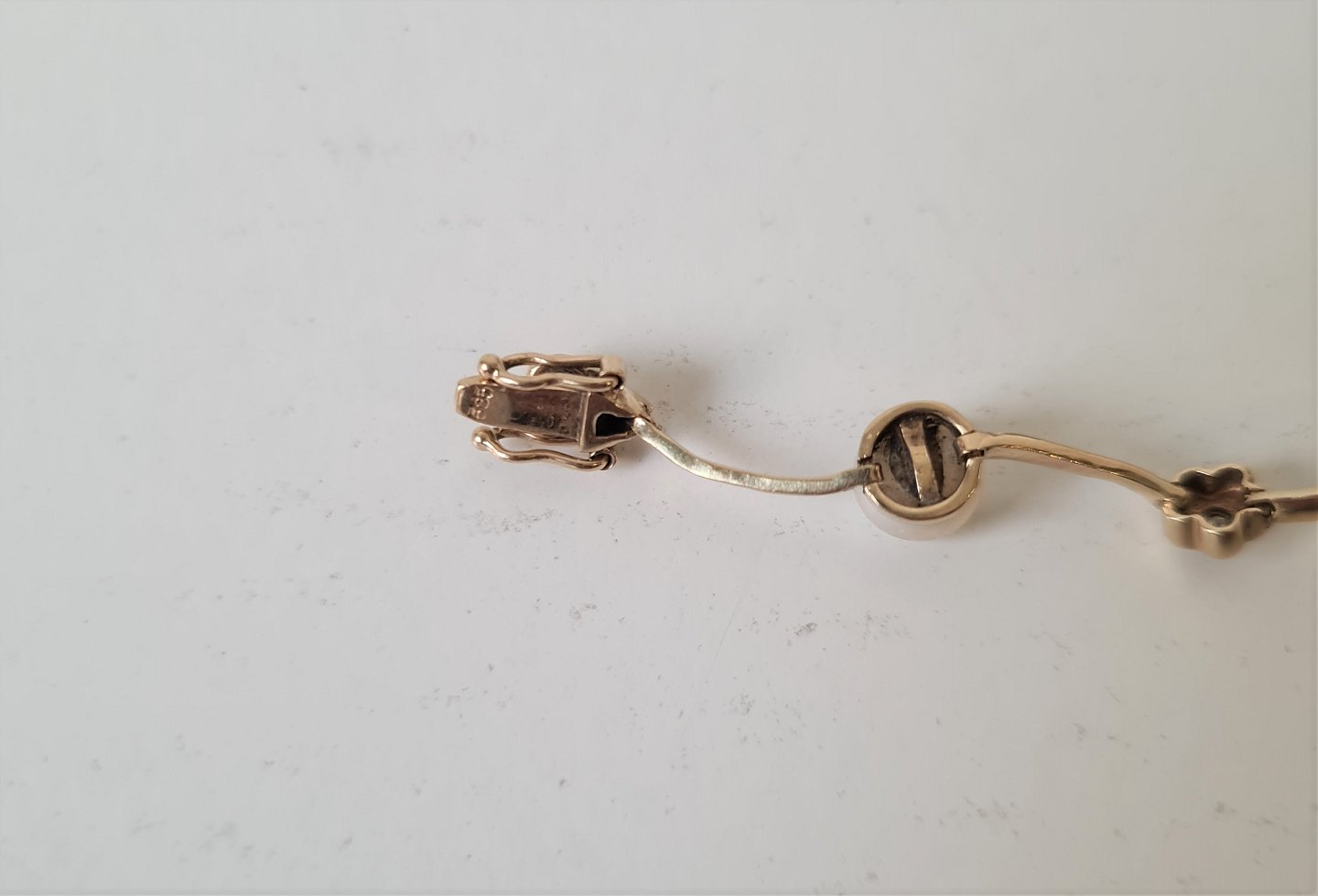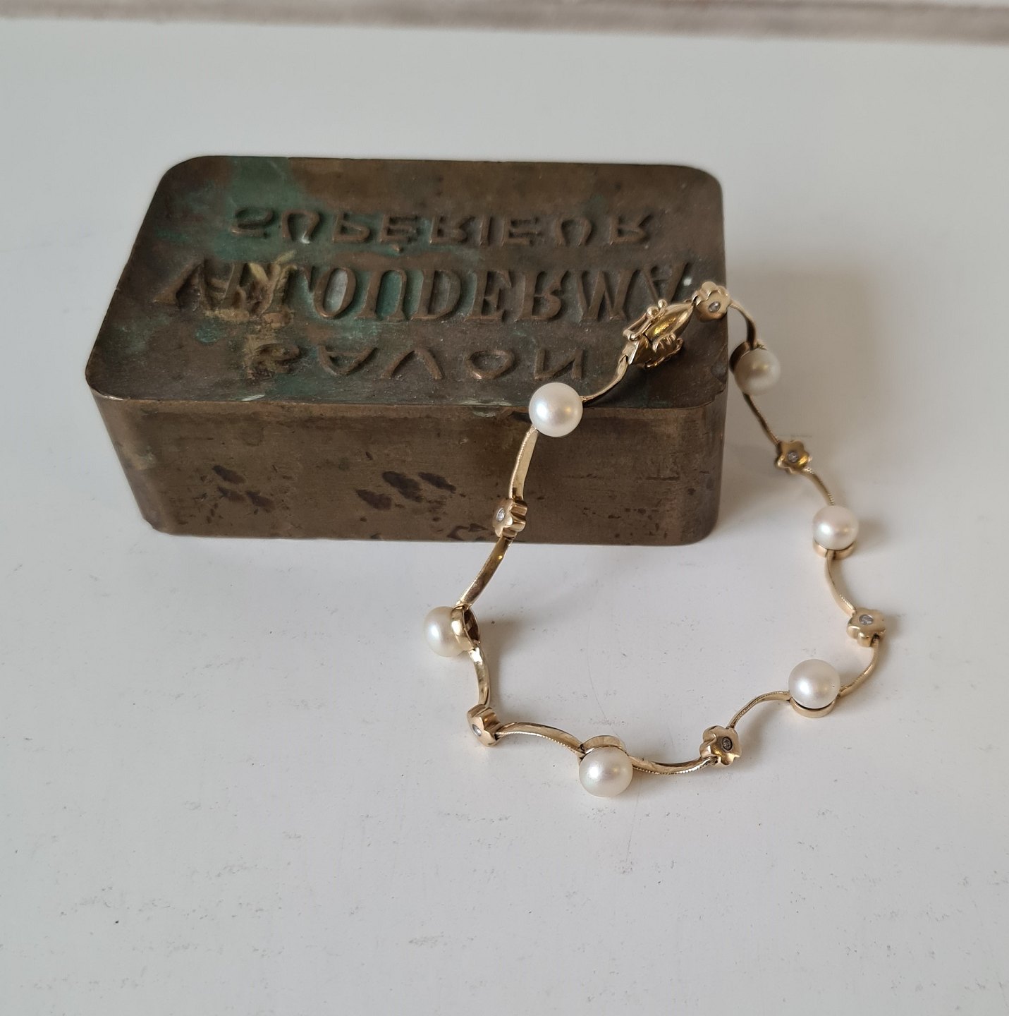 Bernhard Hertz smukt og feminint vintage armbånd i 14 kt guld med 6 perler og 6 brillanter.