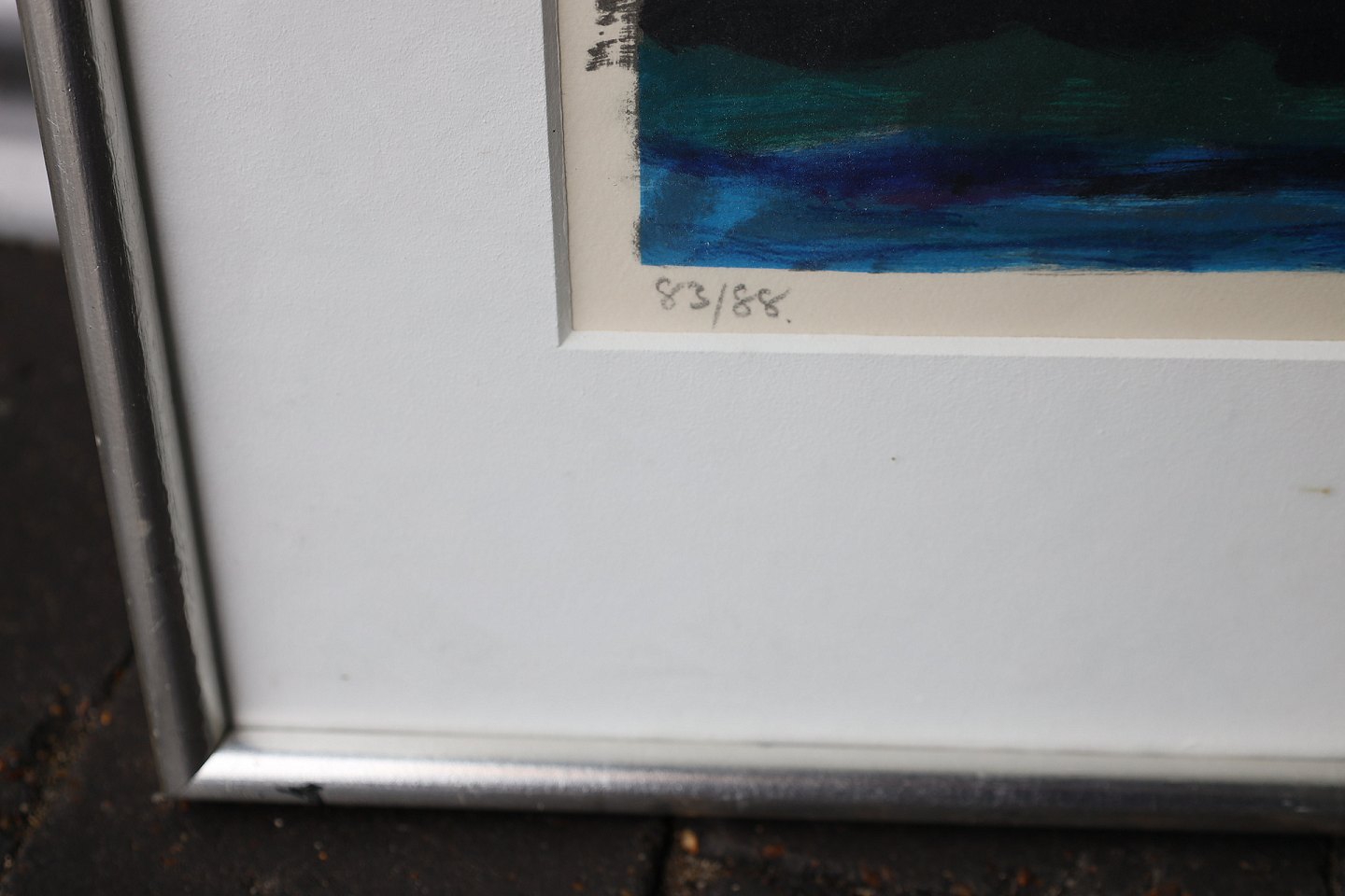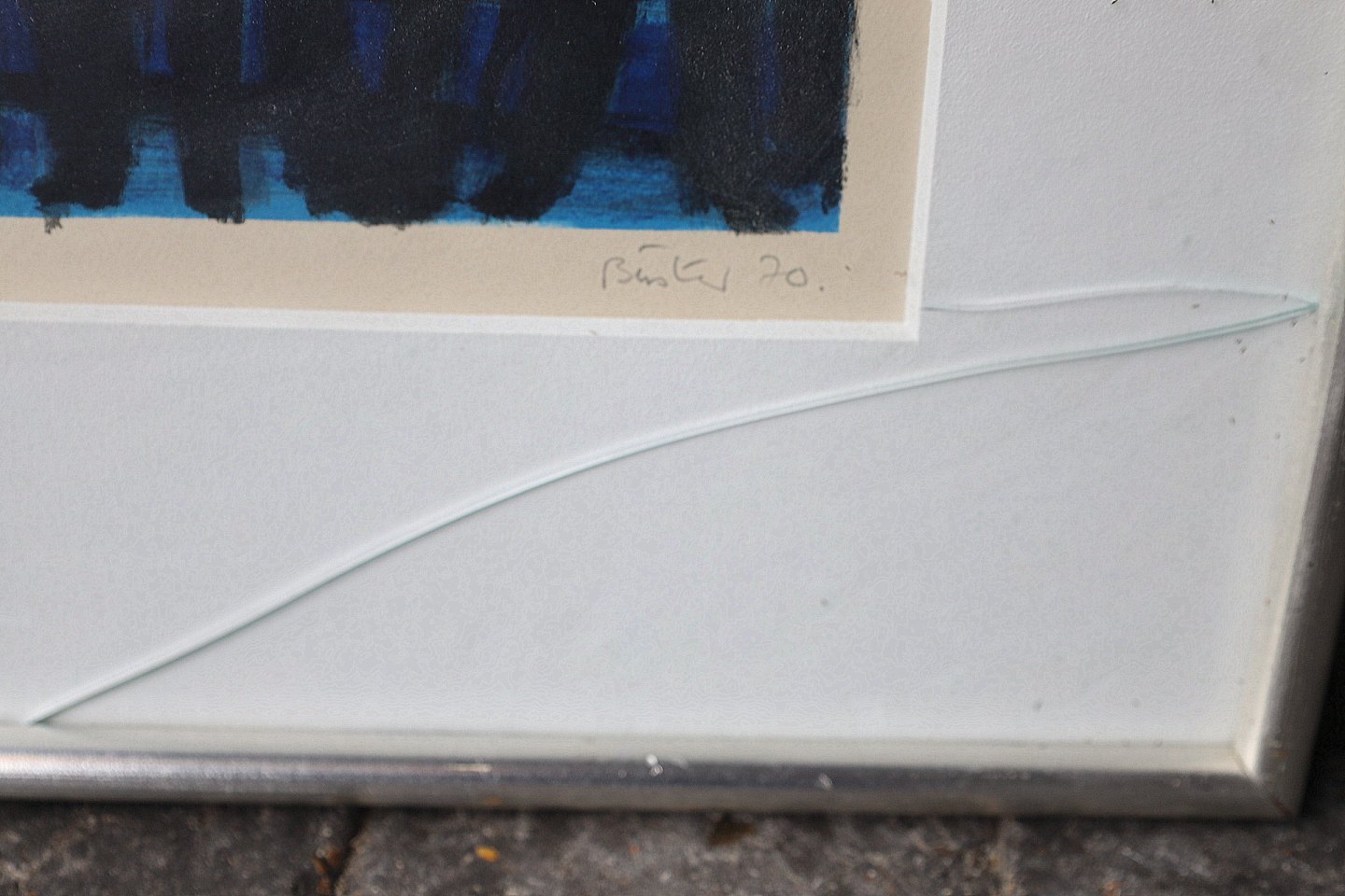 Buster Bruun. Indrammet litografi, nr. 83/88. Litografiet er udførtr i klare, mørke farver