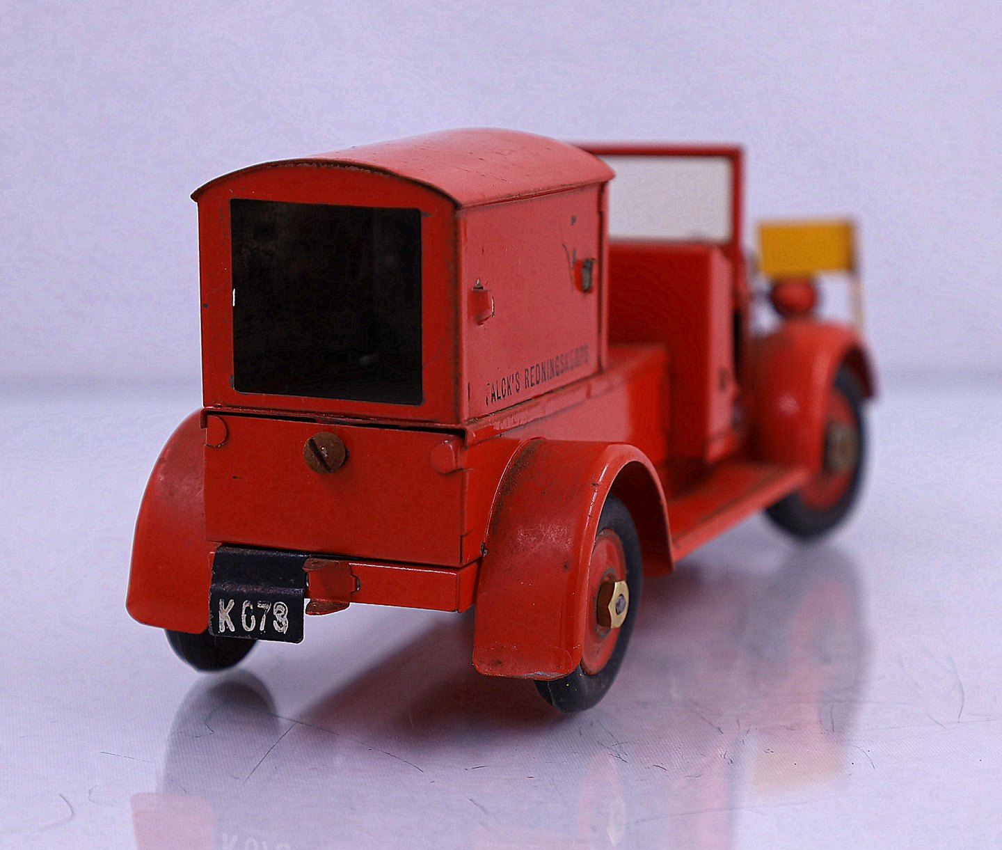 Ladvogn af blik med kasse. På kassen er der plads til økse og reservehjul. Vognen har også gult udryknings flag