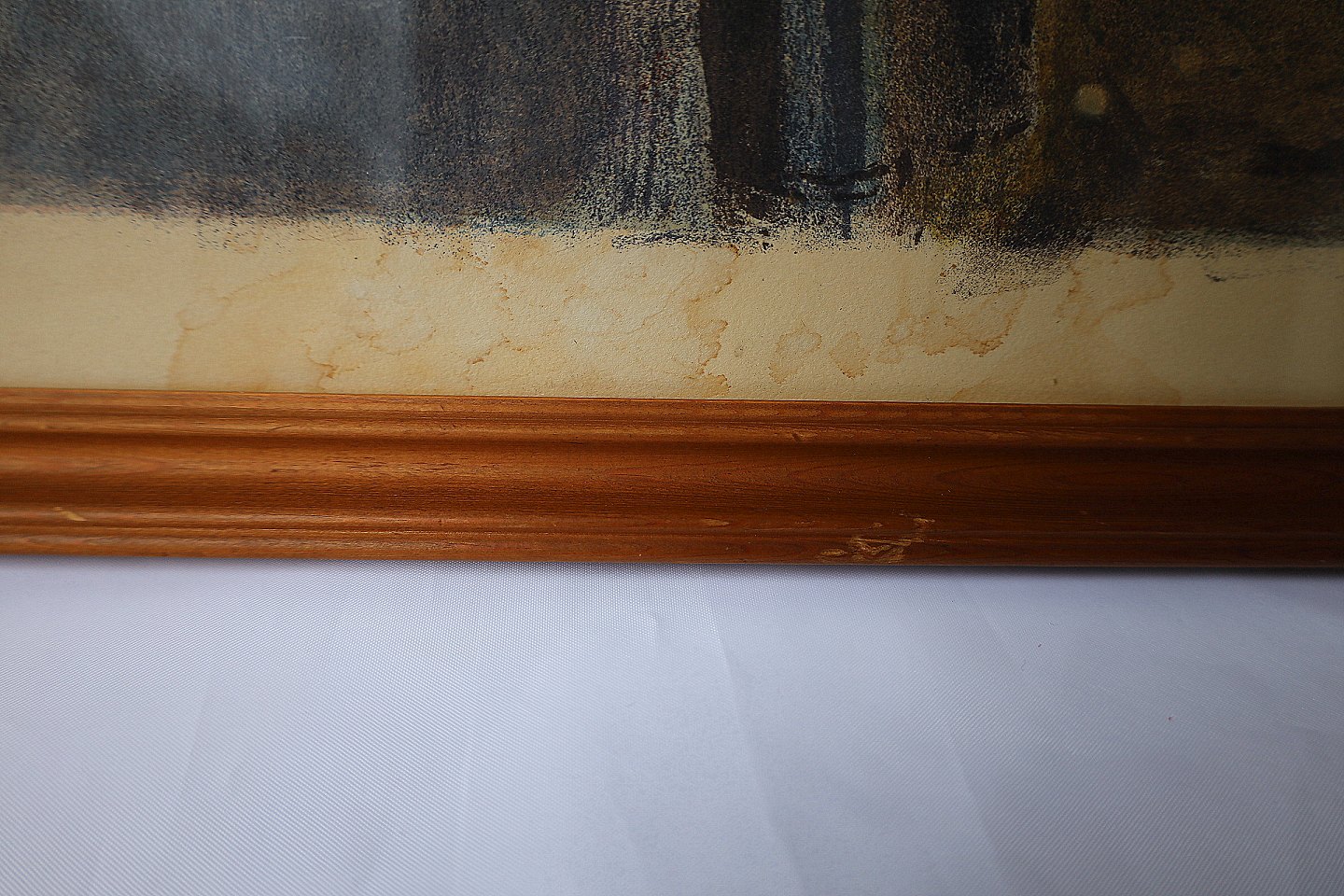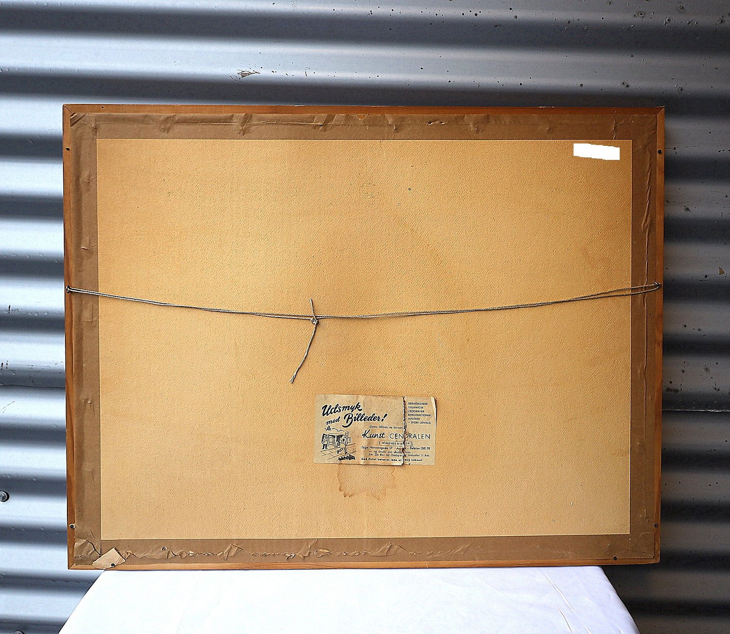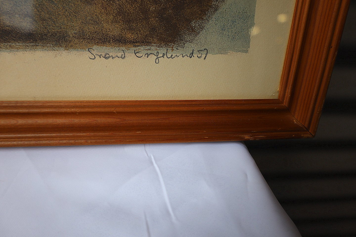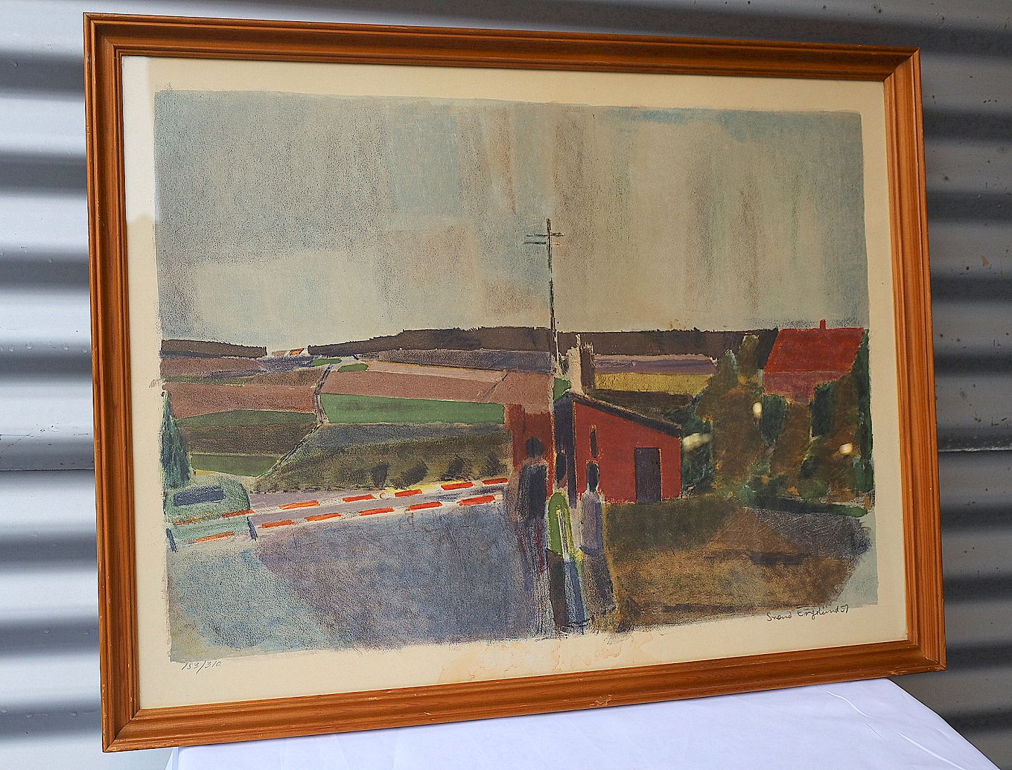 Svend Engelund. Litografi nr. 153/310. 2 mennesker, der står, og kigger ud over landskabet. I landskabet er der røde huse og en mast. Der er enkelte brugsspor på litografien