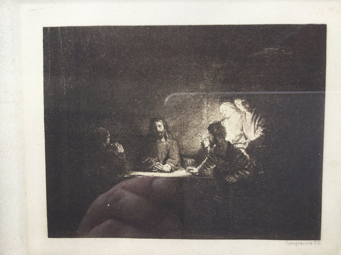 Efter maleri af Rembrandt van Rijn's værksted 1648. Maleriet er ophængt på Statens Museum for Kunst i København og i mange åre troede man det var en ægte Rembrandt.
