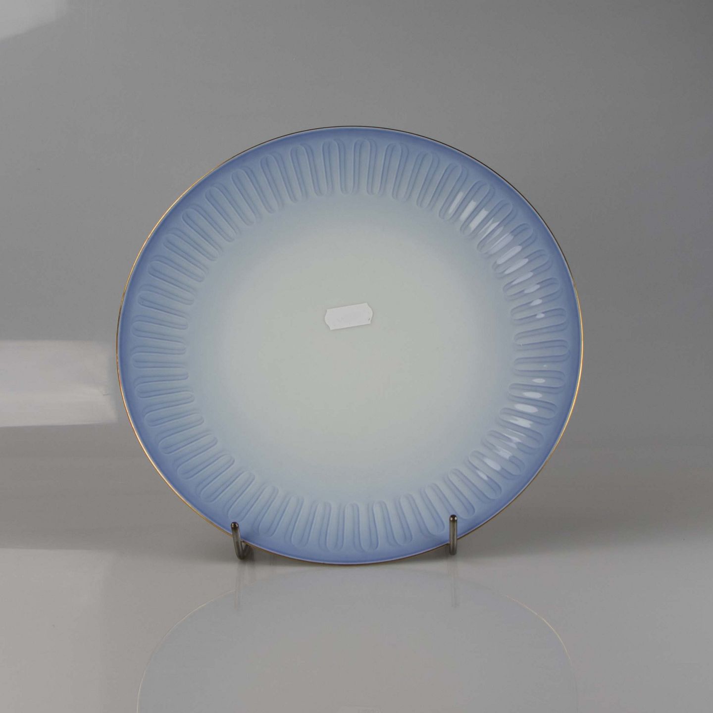 Tallerken fremstillet i porcelæn med stribet motiv i gradueret blå nuancer.