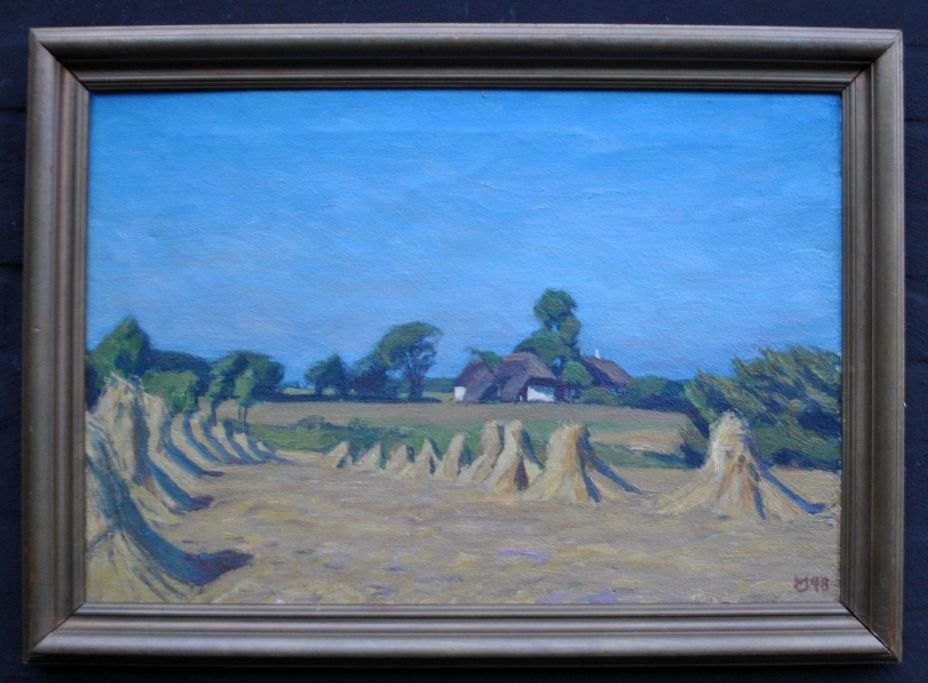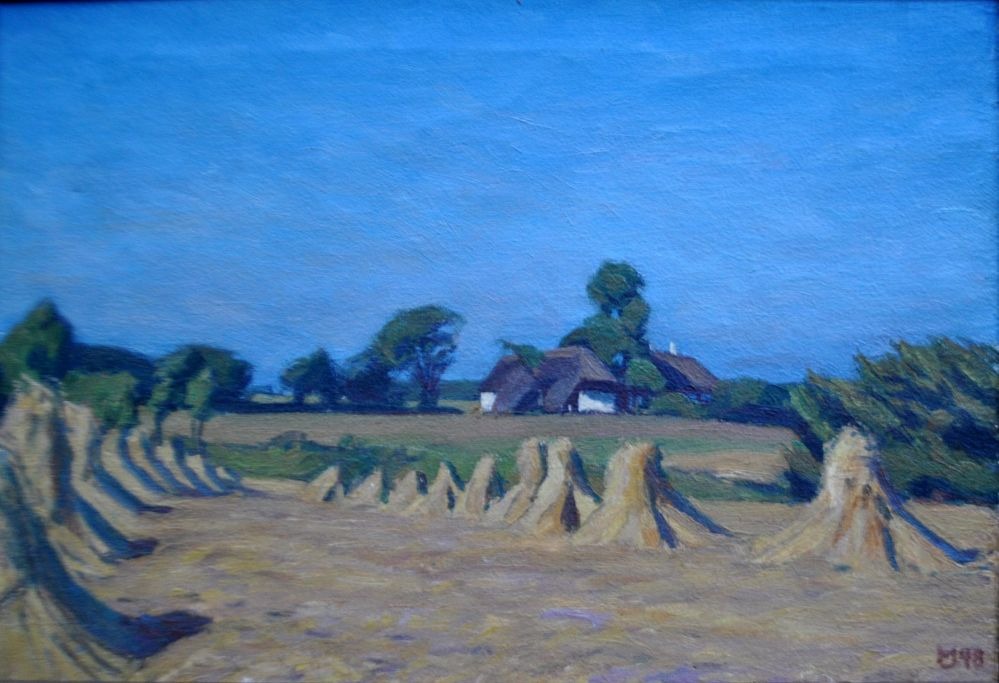 Hindevad, Peter Marius Jensen (1885 - 1977) Danmark: Korntraver på en mark. Signeret 1948. Olie på lærred. 42 x 62 cm.