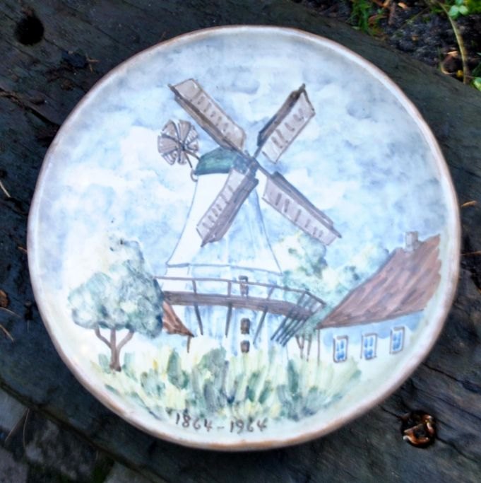 Ruge, Emil (1892 - 1977) Danmark: Fad med Dybbøl Mølle 1864 - 1964. Keramik. Håndmalet. Signeret. Dia.: 21 cm.