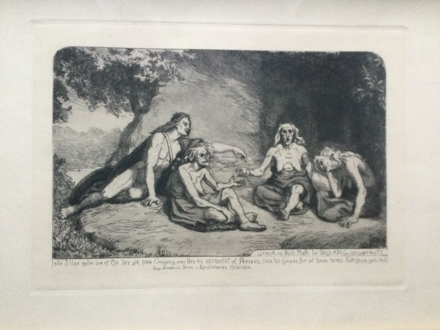 Betegnet - Græsk og Nord: Myth. for Ungd: NFS Grundtvig. 1847 pag. 93. samt "Alle 3 lige gode om et Øje, der gik paa Omgang, men blev nu opsnappet af Perseus, saa de Graae, for at feea deres Fattigdom igen, maa."