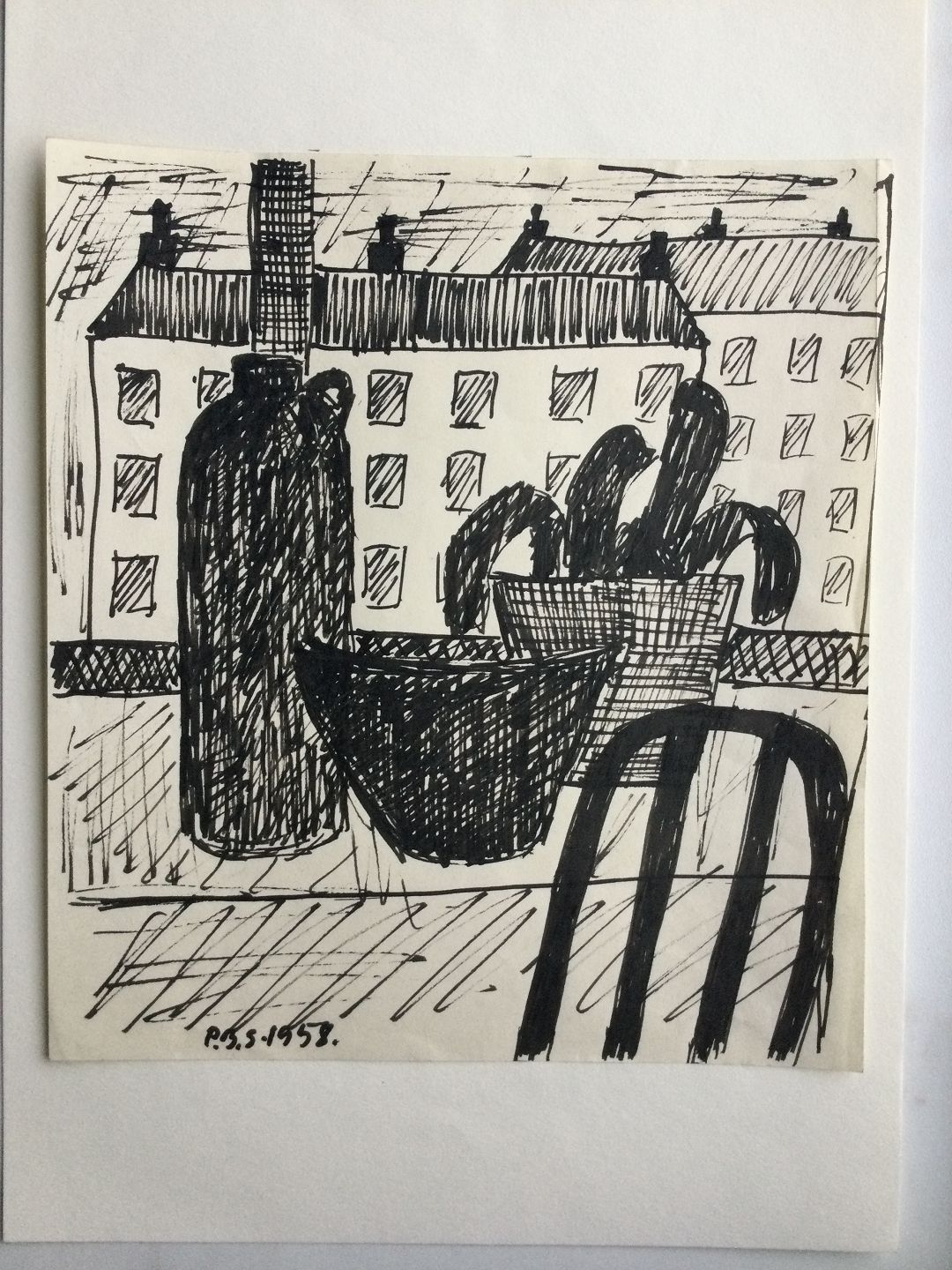 Text available in Danish: Tegning af Peder Brøndum Sørensen - Opstilling i vindue med krukker og kaktus 1958.