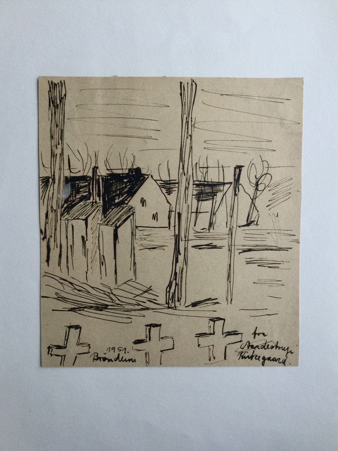 Tegning af Peder Brøndum Sørensen - Parti fra Aardestrup kirkegaard 1951.