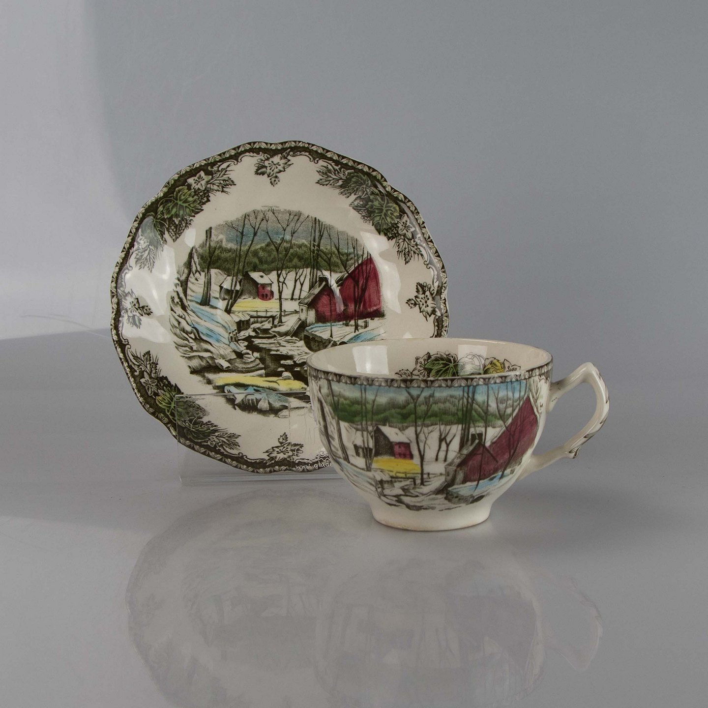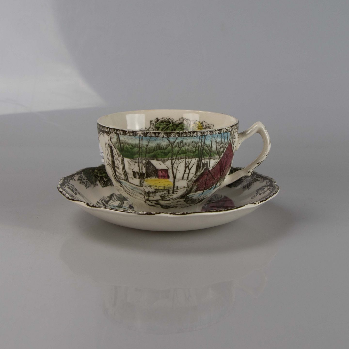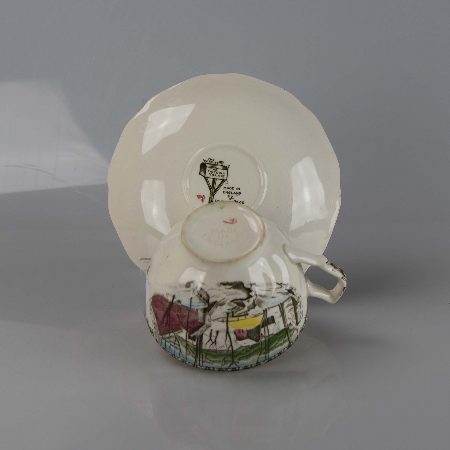 Kop med underkop i engelsk fajance fra stellet The friendly village