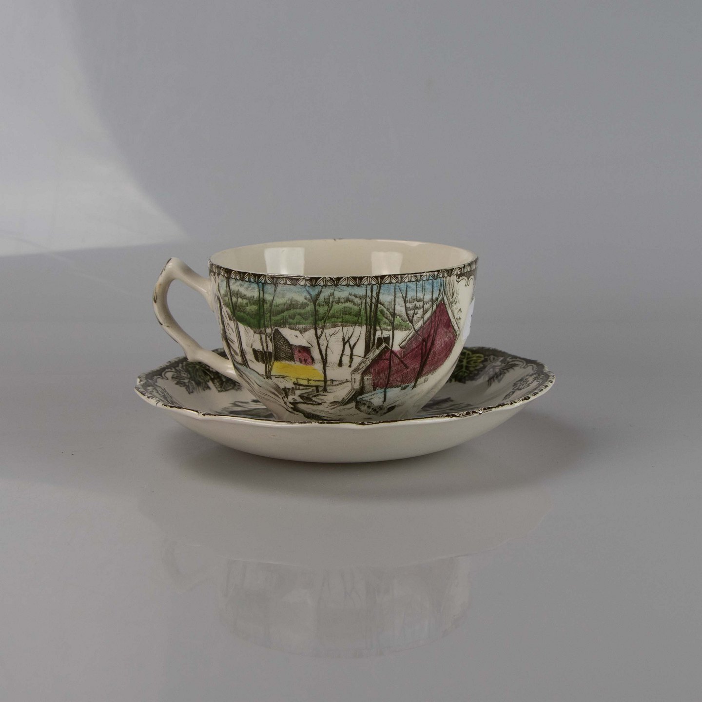 Kop i lys fajance med multifarvet landsbymotiv af The ice house.