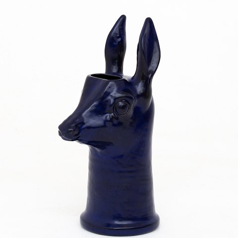 Vase i form af hjortehoved i fajance med mørkeblå glasur. Signeret.