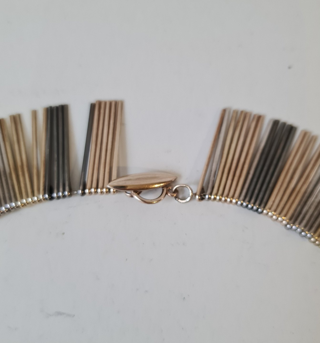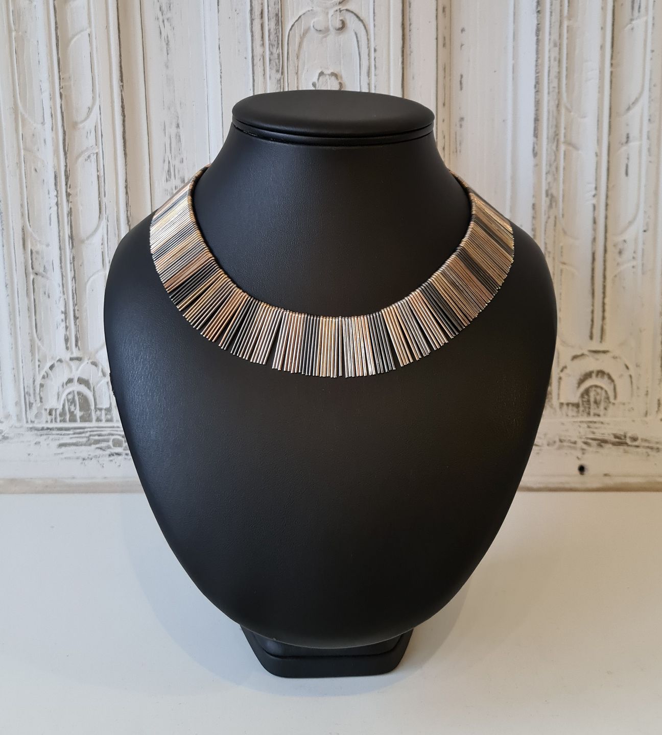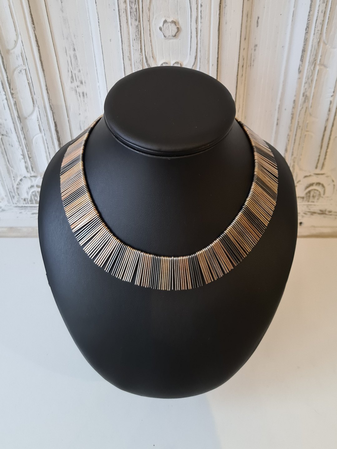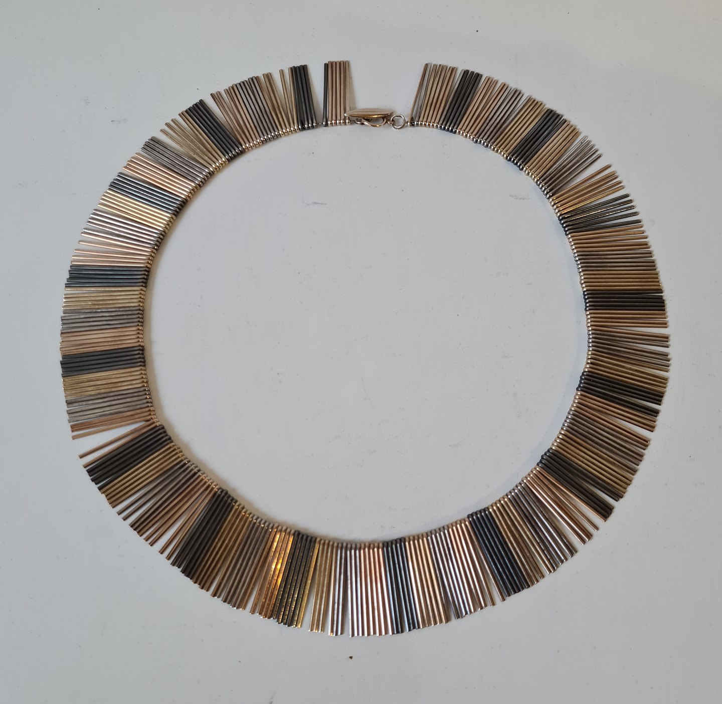 Eigil Jensen for A.Michelsen collier i tre farvet sterlingsølv, sølv, oxideret sølv og forgyldt sølv.