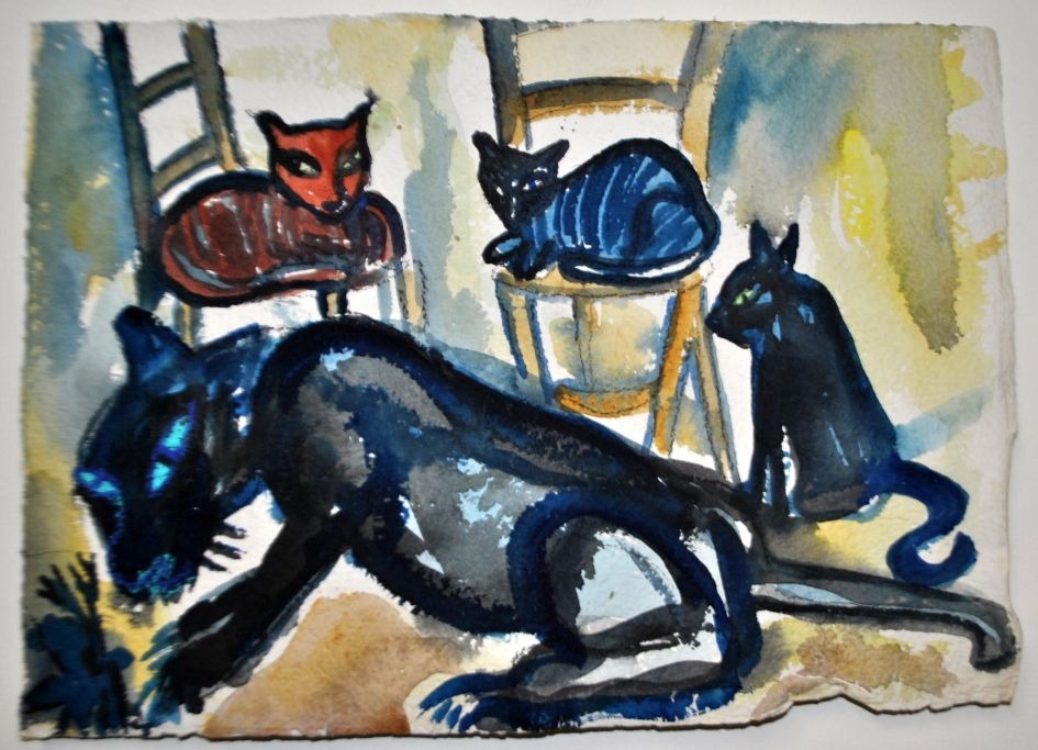 Degett, Karen (1954 - 2011) Danmark: Katte på restaurant, Kreta, Grækenland. Bly/akvarel på papir. Usigneret. 28 x 39 cm. Uindrammet.  Proveniens: Kunstnerens bo.