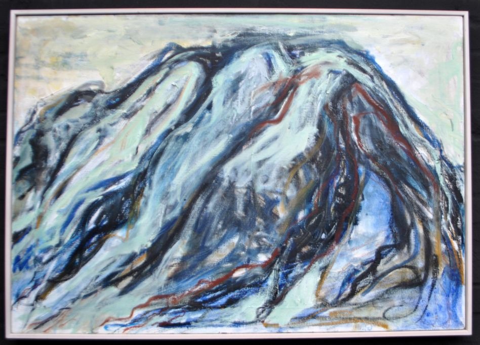 Degett, Karen (1954 - 2011) Danmark: Bjerglandskab - Norge. Olie på lærred. Verso signeret: Karen Degett 96. 70 x 100 cm.  Indrammet. Proveniens: Galleri Sonne, Studsgade 7, 8000 Aarhus C, hvor Degett var repræsenteret.  Karen Degett boede og studerede i Bergen, Norge i 1975.