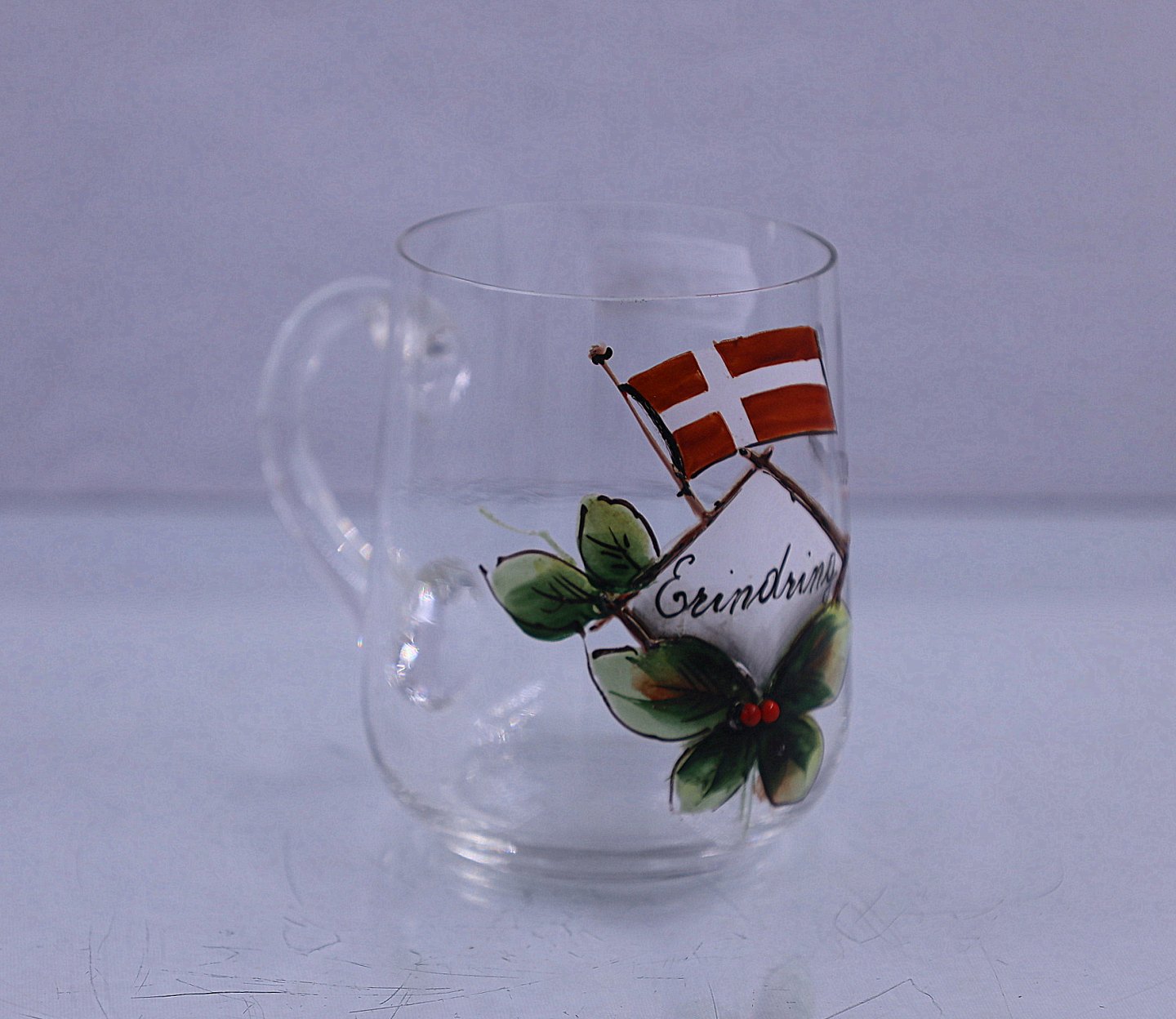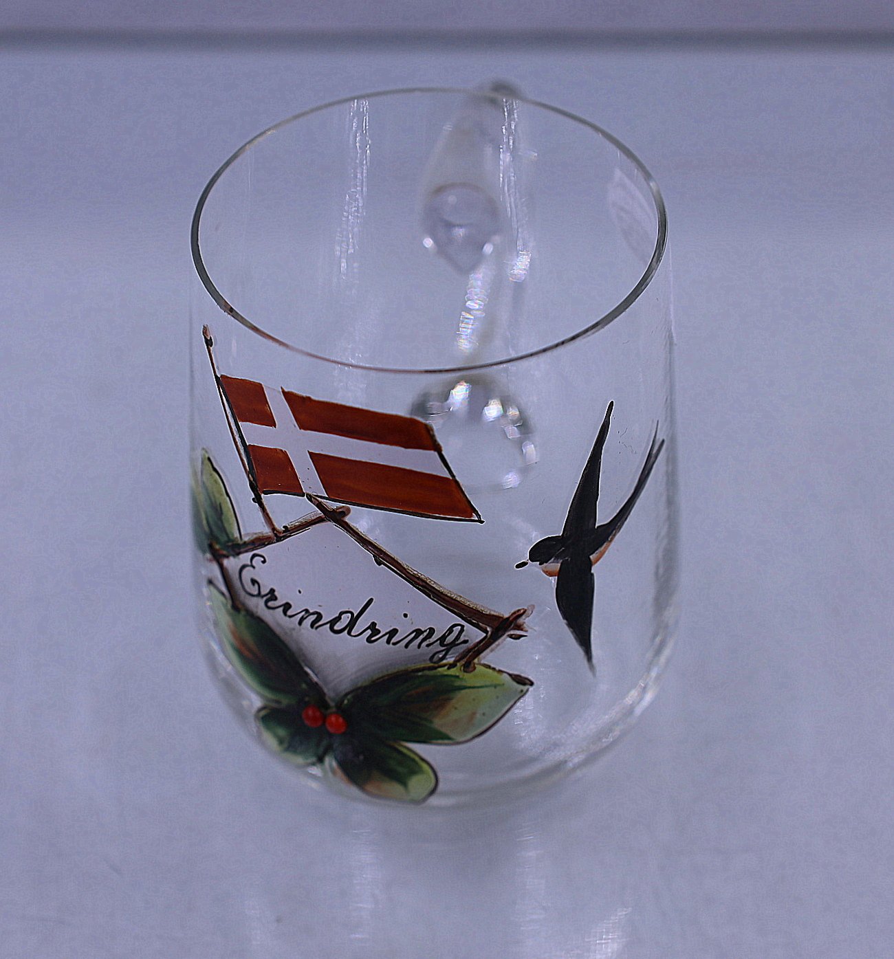 Erindringskrus med dannebro. Kruset er øre/hank og dekoreret med blomst, flag og svale. Der er ingen brugsspor