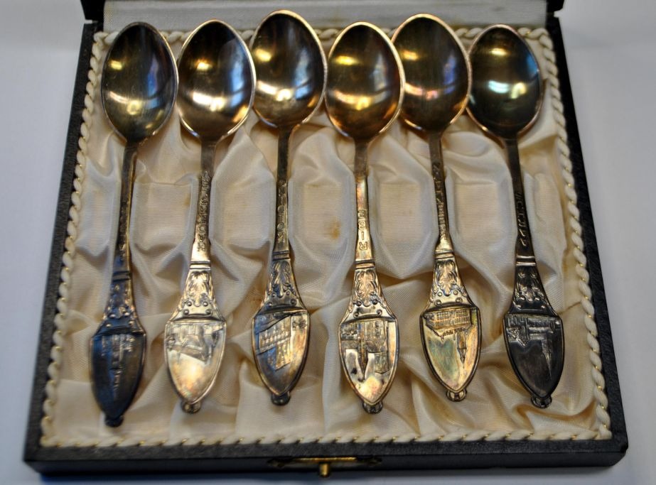 Samling af 6 theskeer i sølv, 20. årh. Danmark. I original æske. Med motiver fra Aarhus, København, Ribe, Kolding, Haderslev og Aalborg.