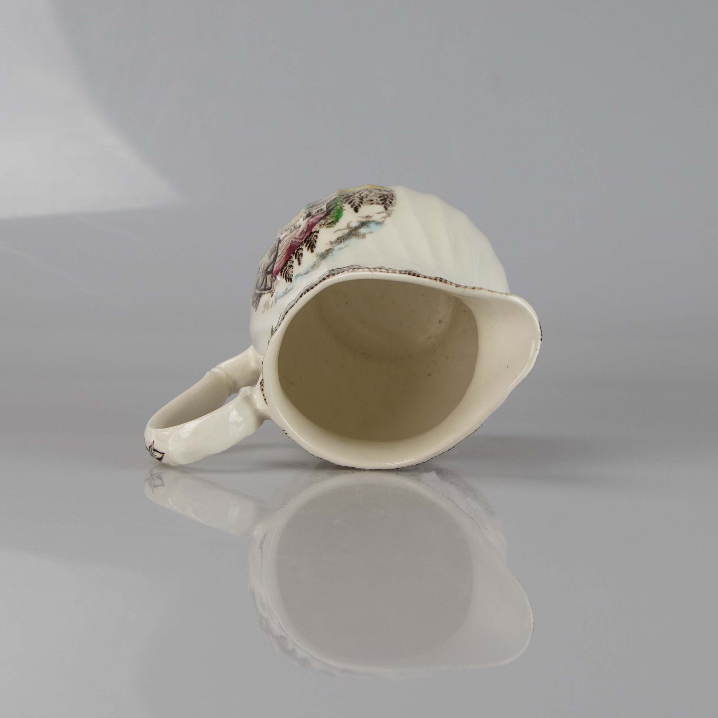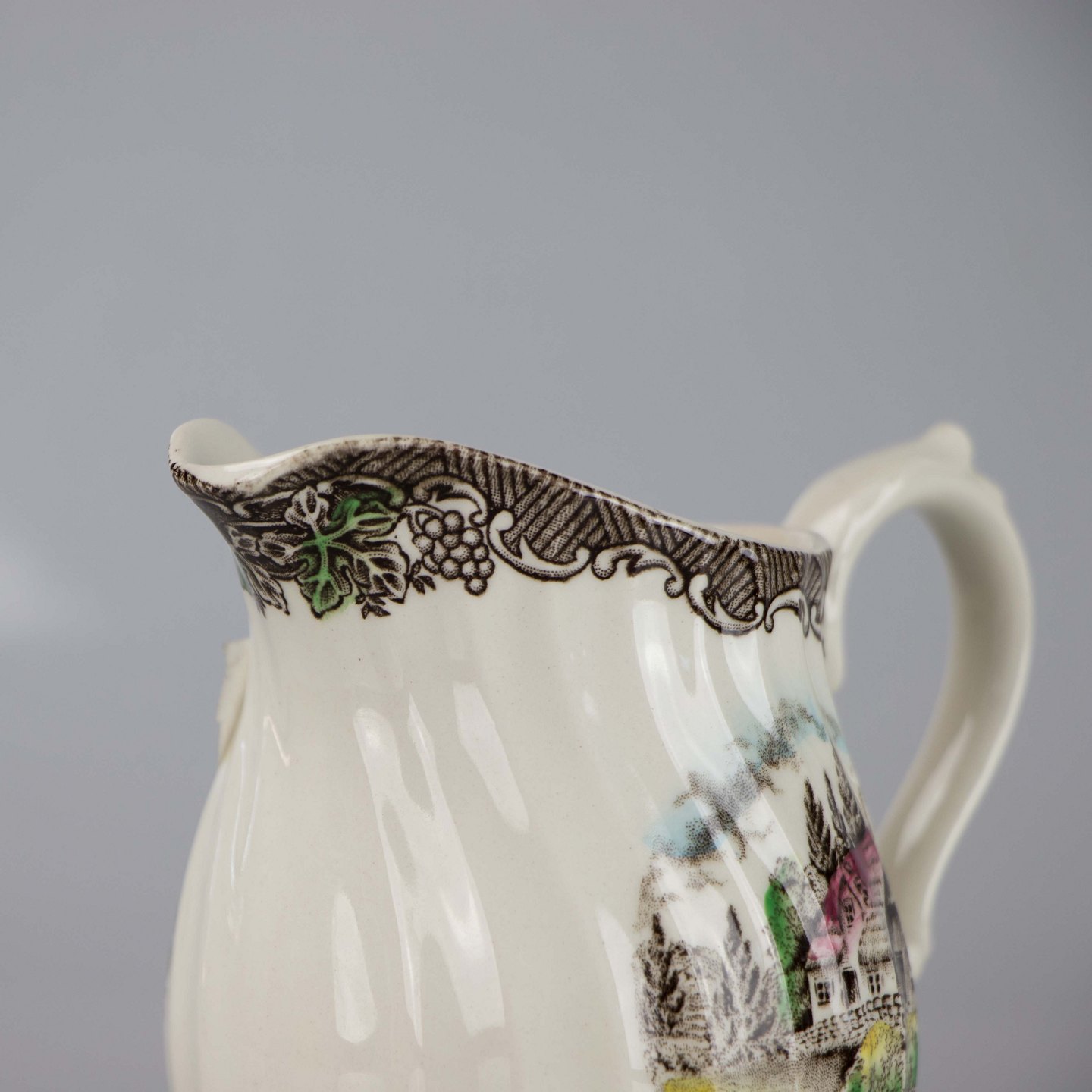Kande i lys fajance med multifarvet landligt motiv.