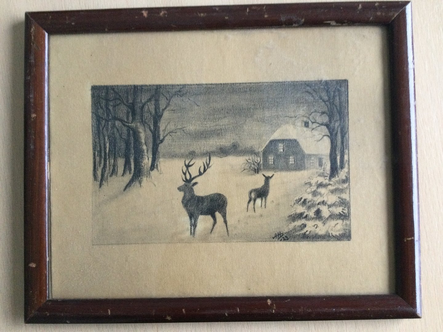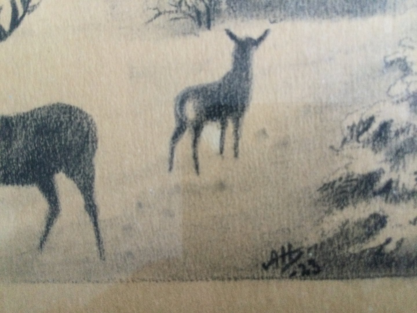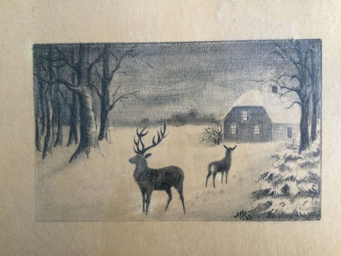 Radering af Axel Holm - Vinterlandskab med kronvildt.