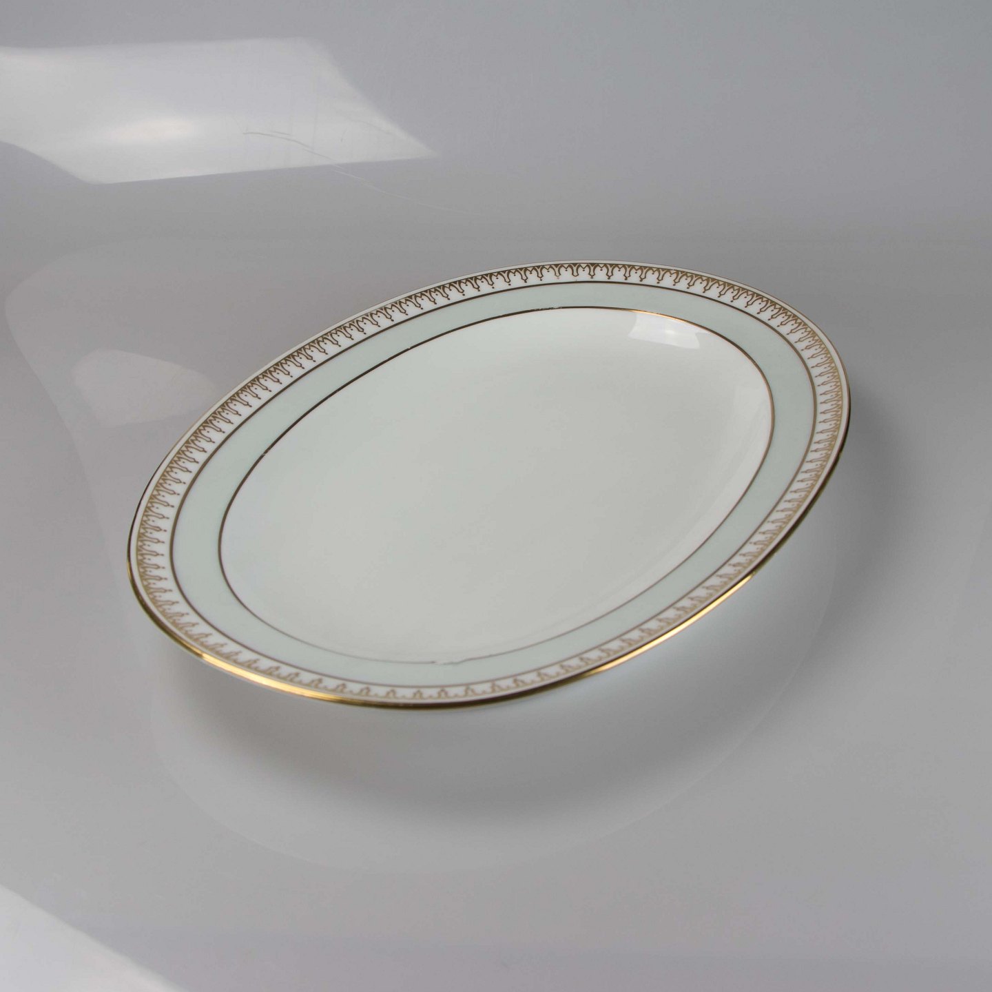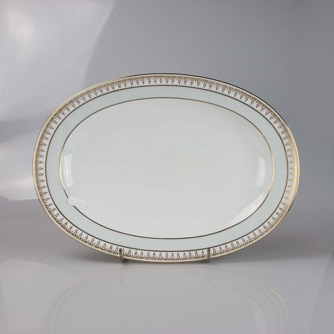 Fad i hvidt porcelæn med lysegrøn kant og gylden dekoration