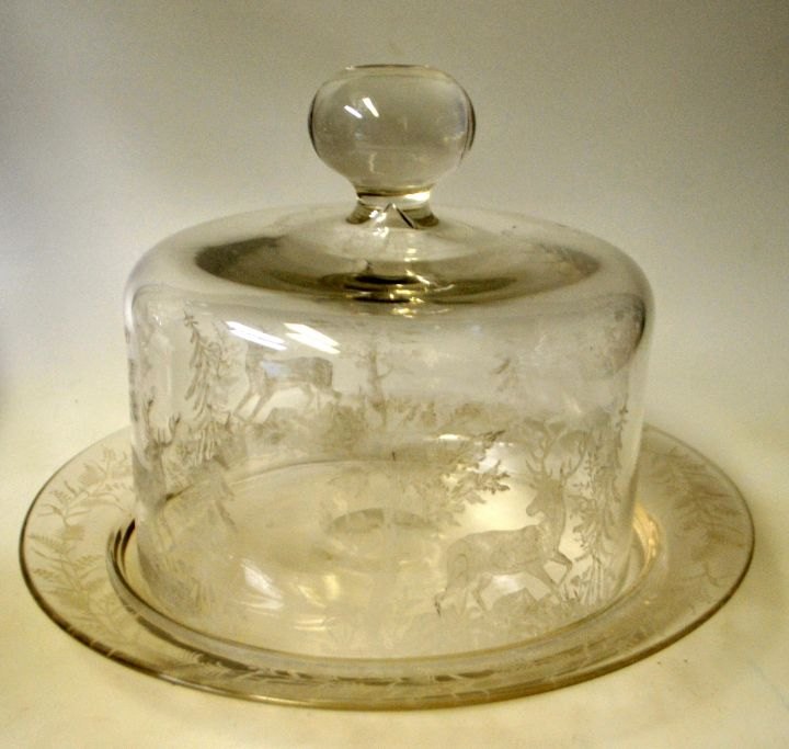 Osteklokke med hjortemotiv og tilhørende fad, ca. 1910. Holmegård, Danmark.
