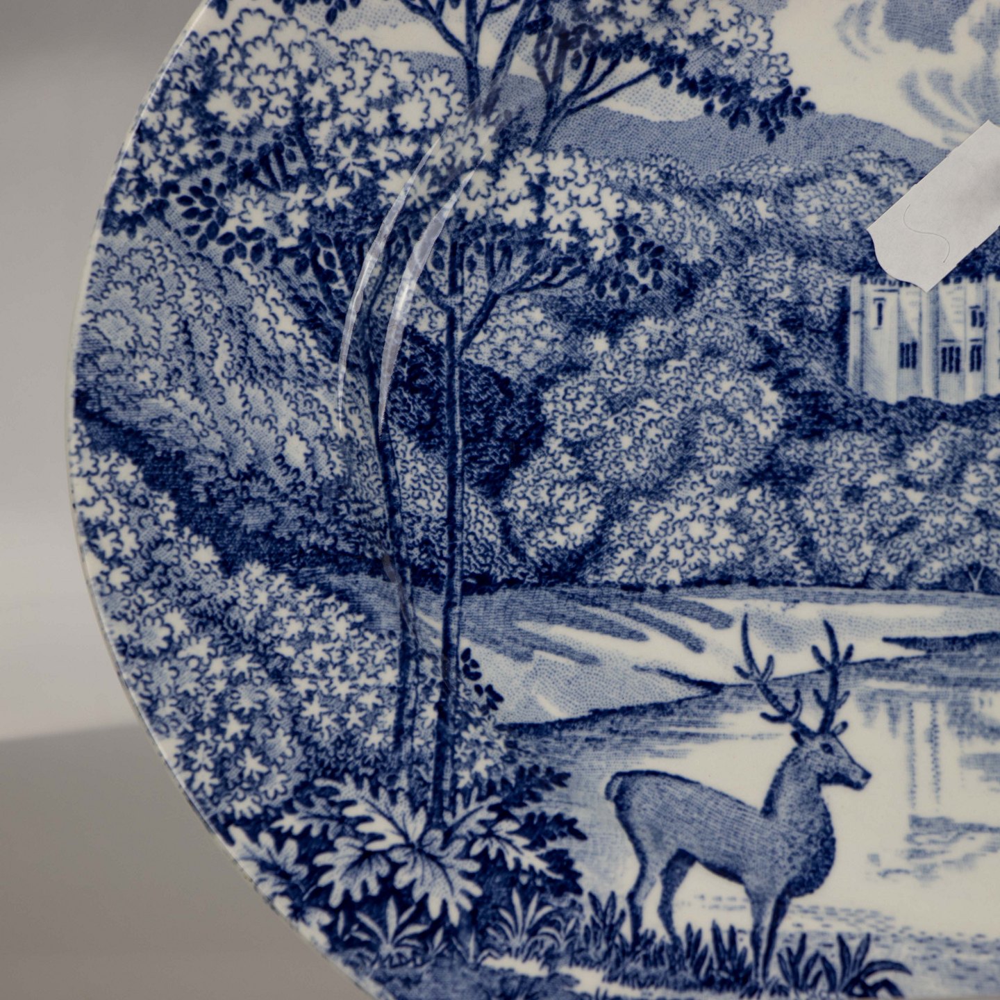 Fad i lys fajance med blådekoreret slotsmotiv.