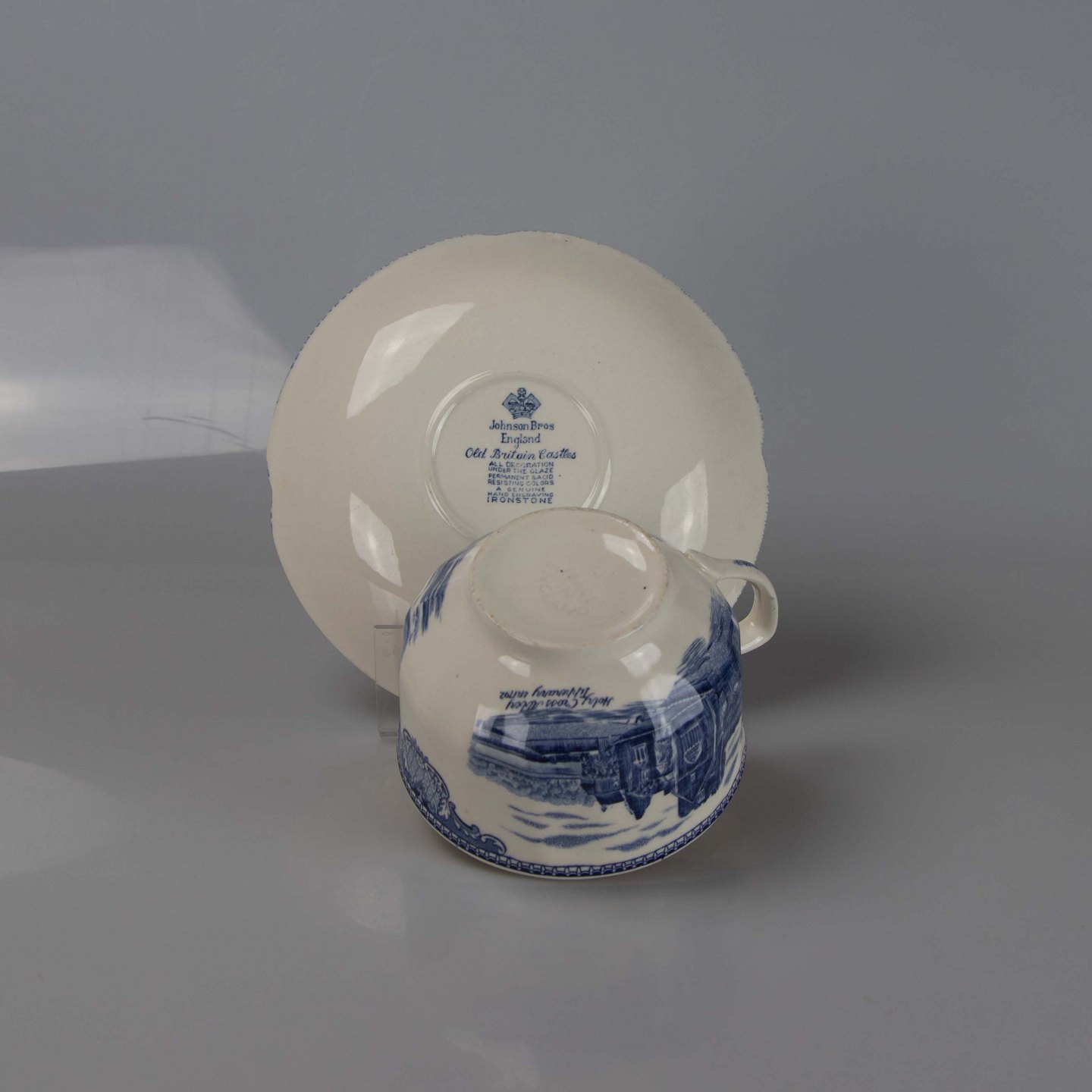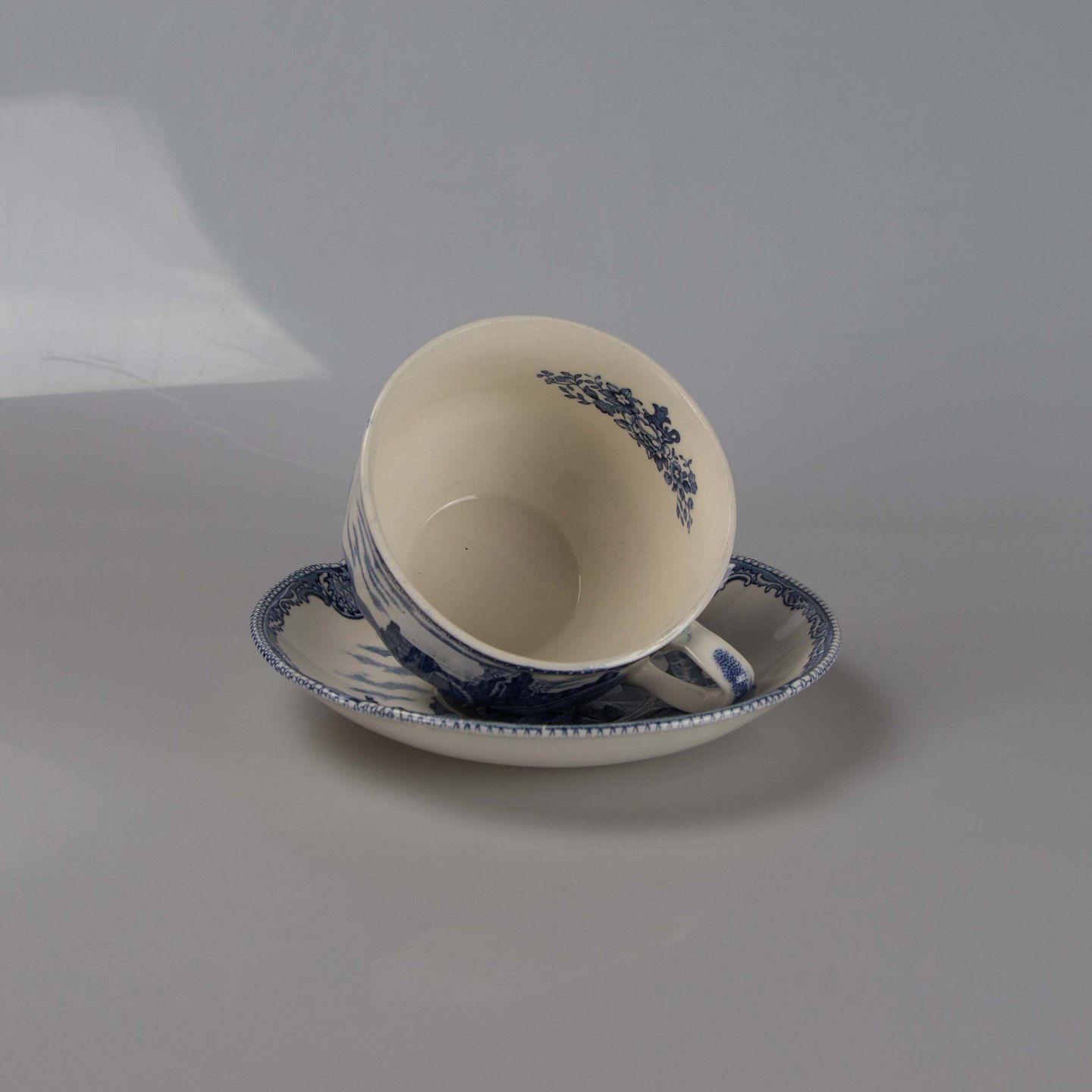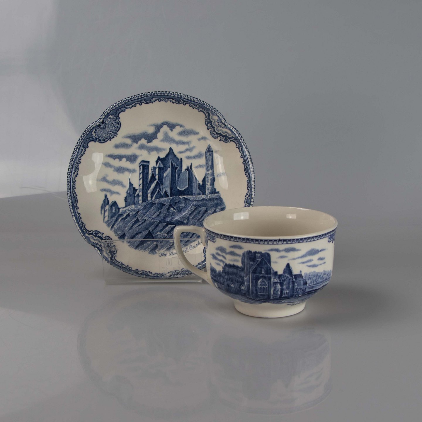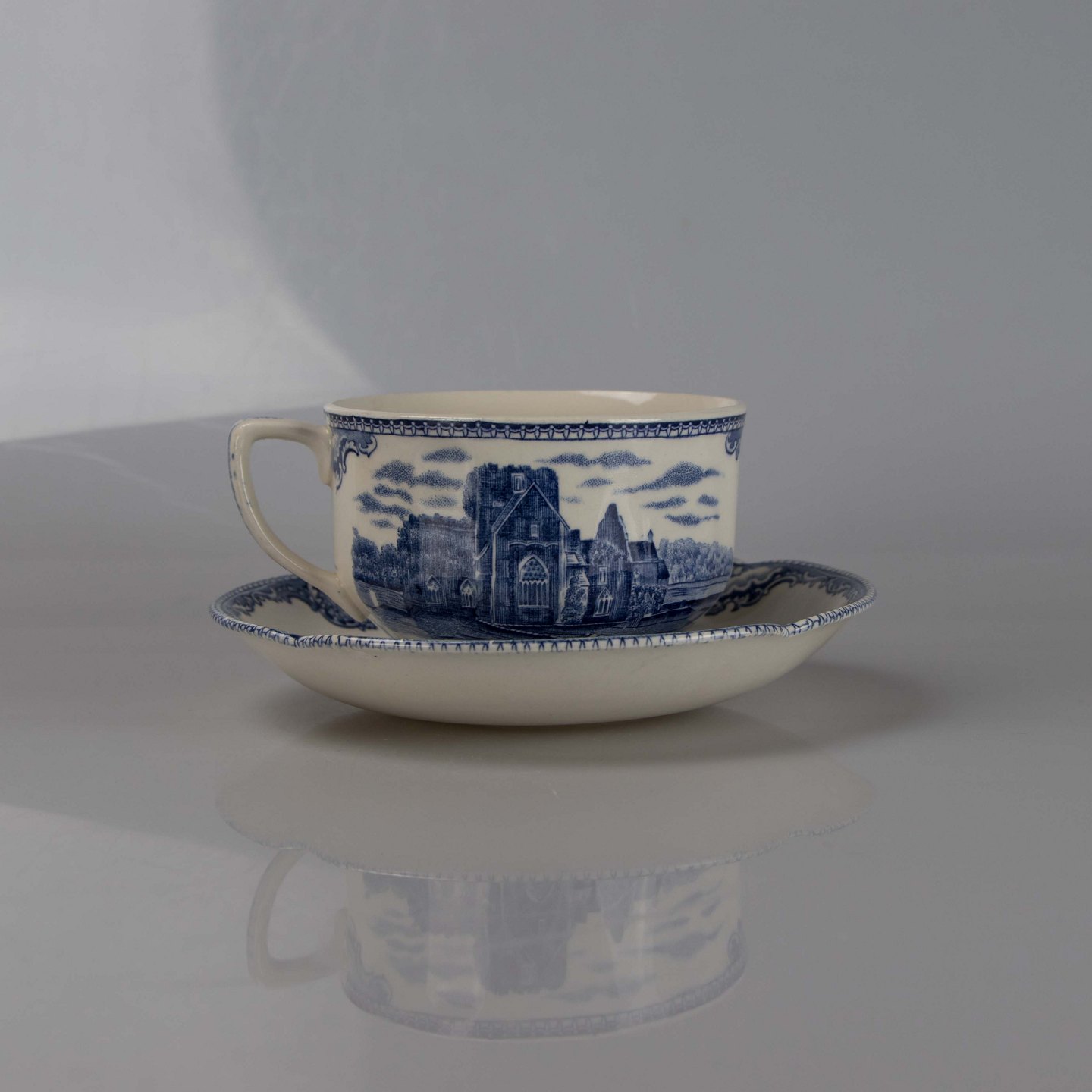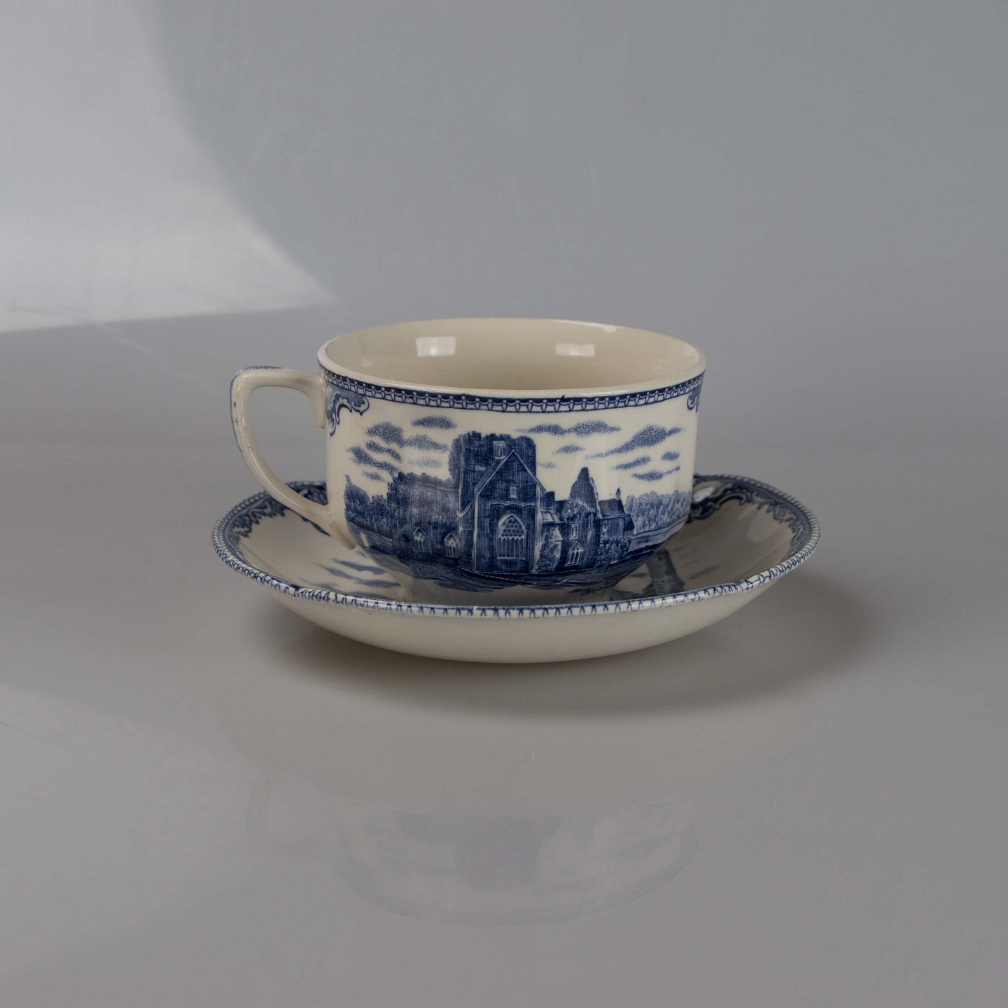 Kaffekop med underkop i engelsk fajance fra stellet Old Britain Castles blue
