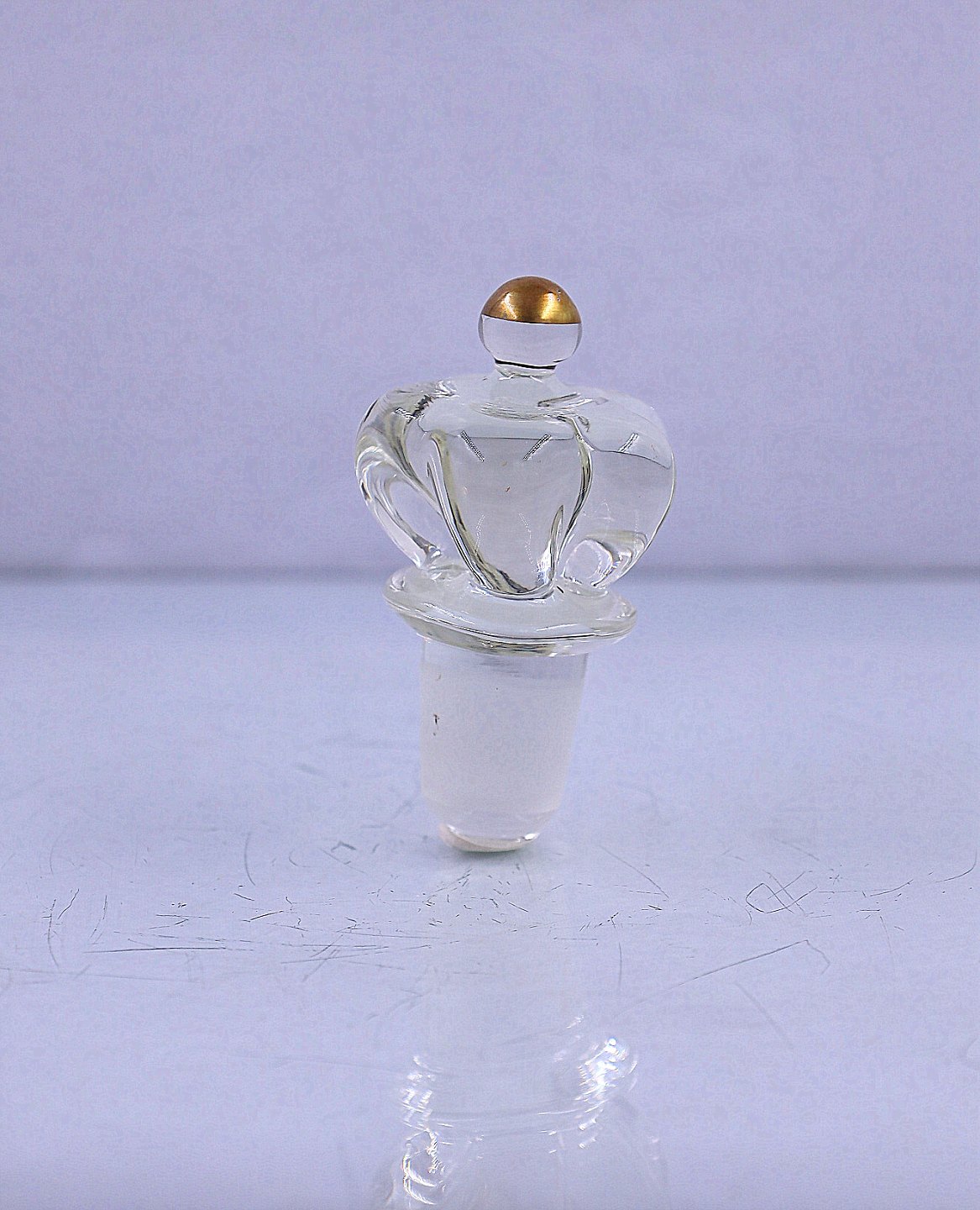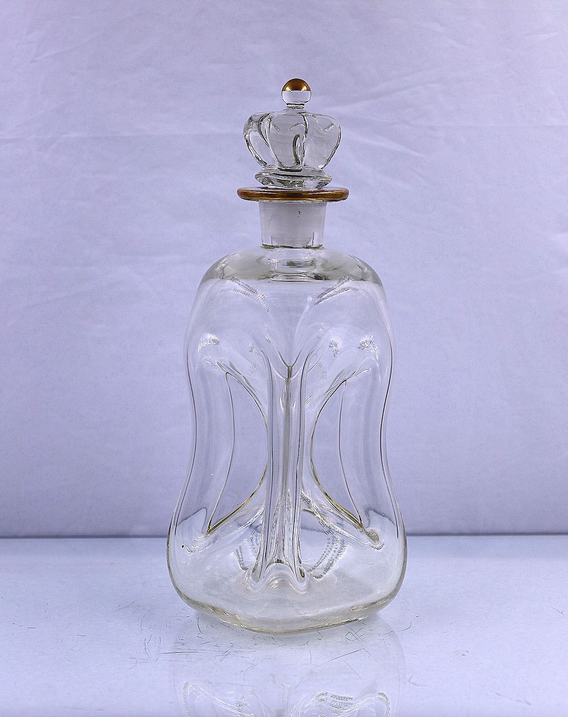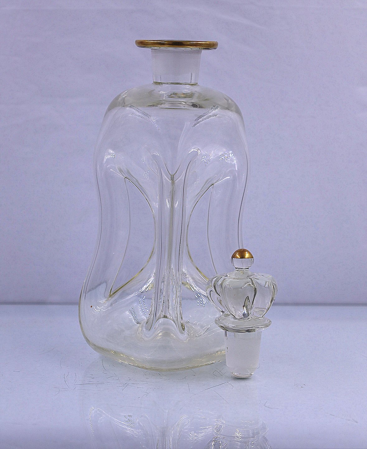 Holmegaard Glasværk. Klukflaske med kongeprop. Klukflasken er med guld på kraven og på tip af proppen.