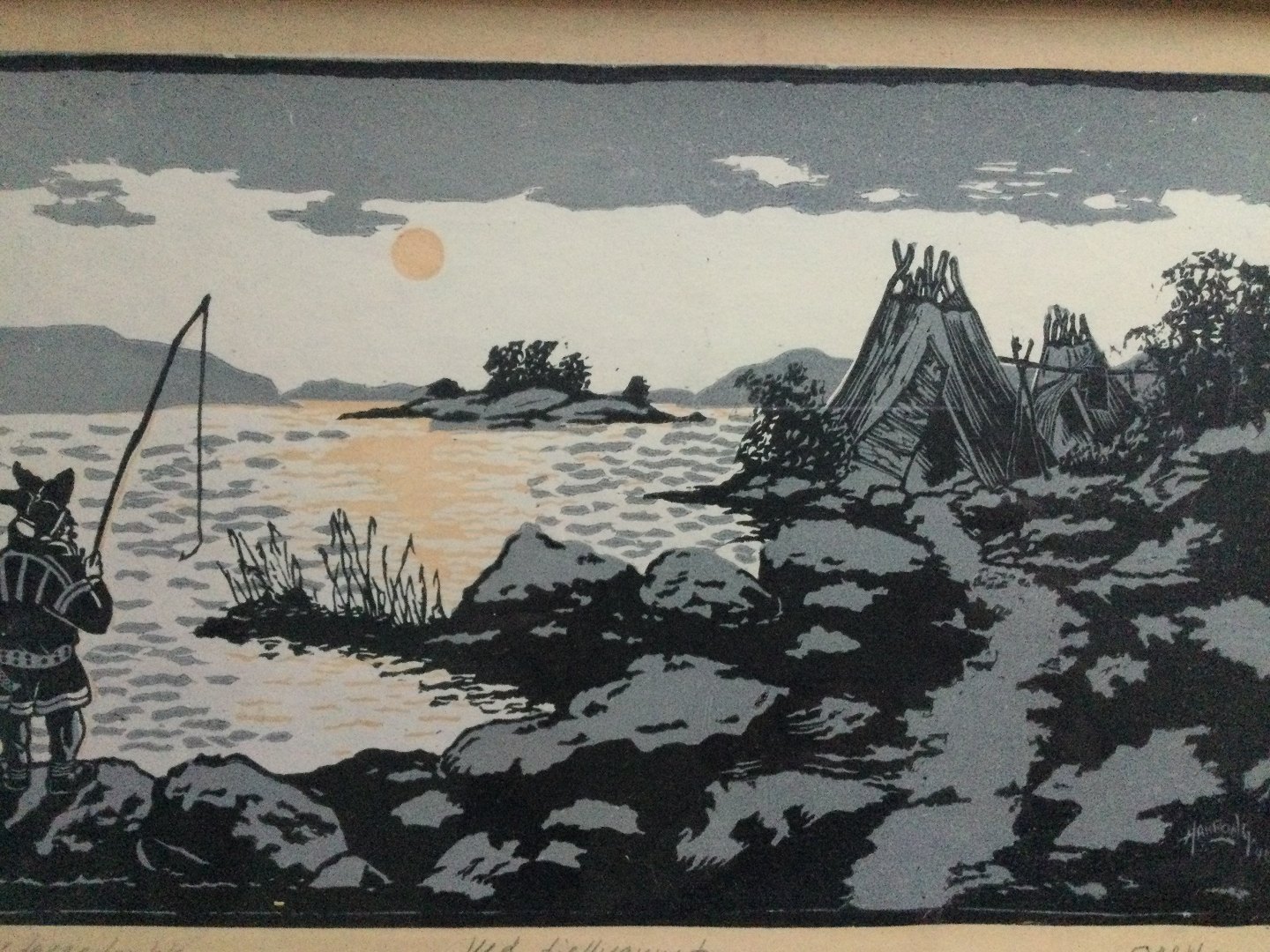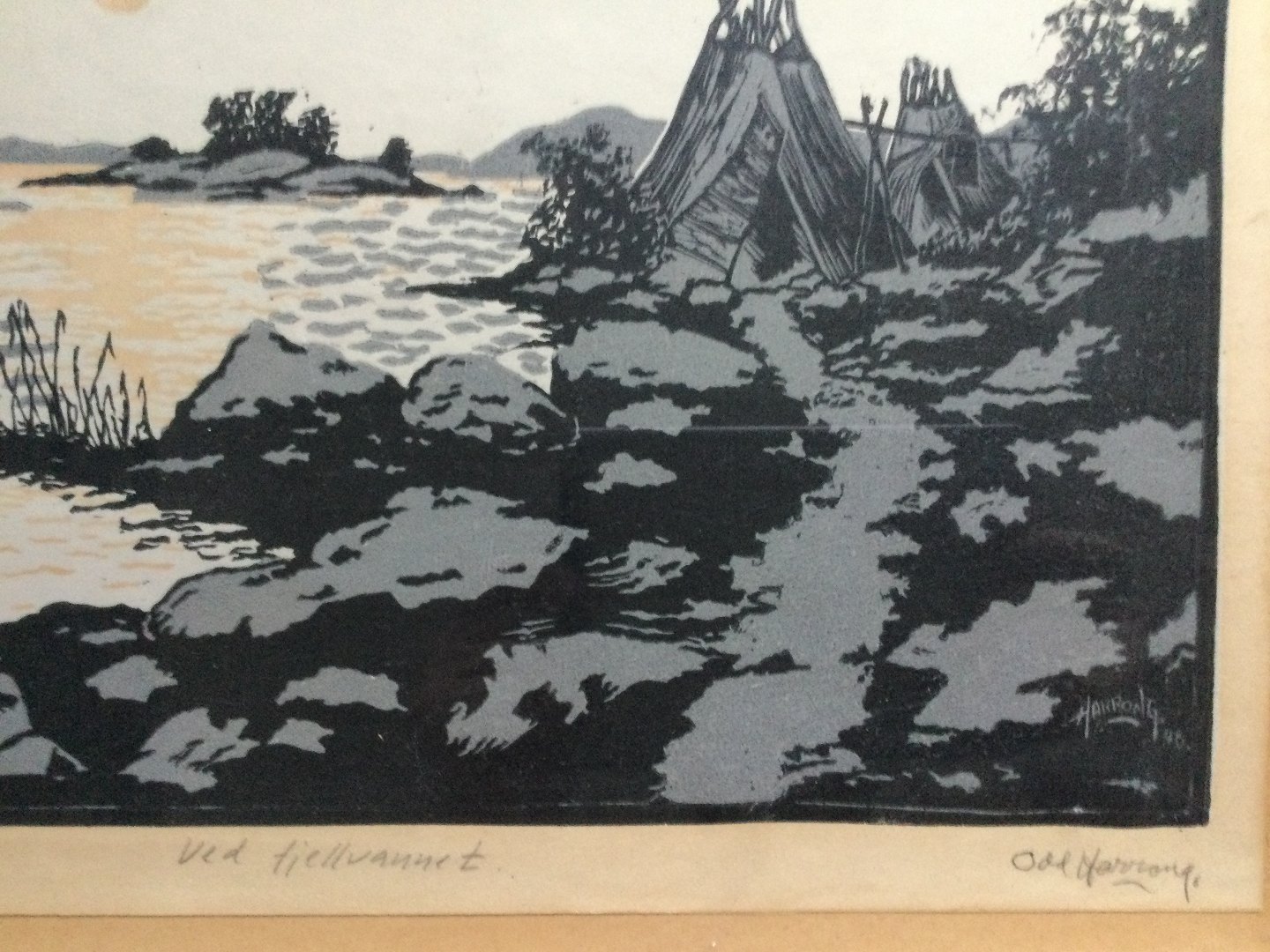 Farvetræsnit af Odd Harrong 1957 - "Ved Fjellvannet"