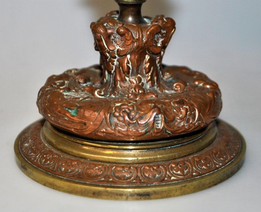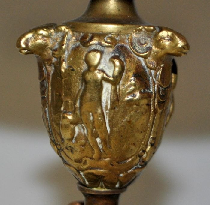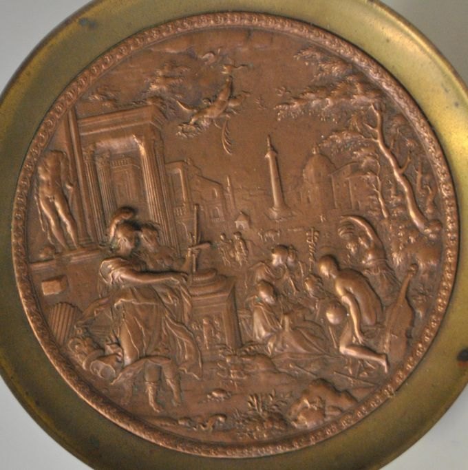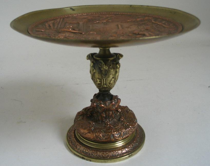 Fransk tazza i bronze/kobber, 19. årh. Rund fod med dekorationer i form af bladværk. Mellemstykke i kobber med bladværk, maskeroner og ligggende kvinder. Vaseformet stamme i bronze med dokorationer i form af vædderhoveder, Diana og putto. Kumme i bronze/kobber med klassisk scene med Gudinder. H.: 14 cm. Dia. kumme.: 18 cm.
