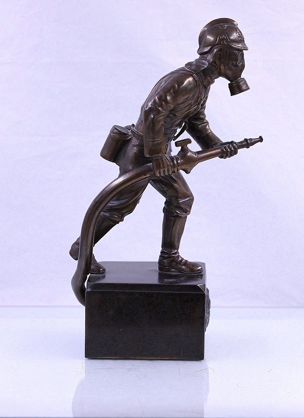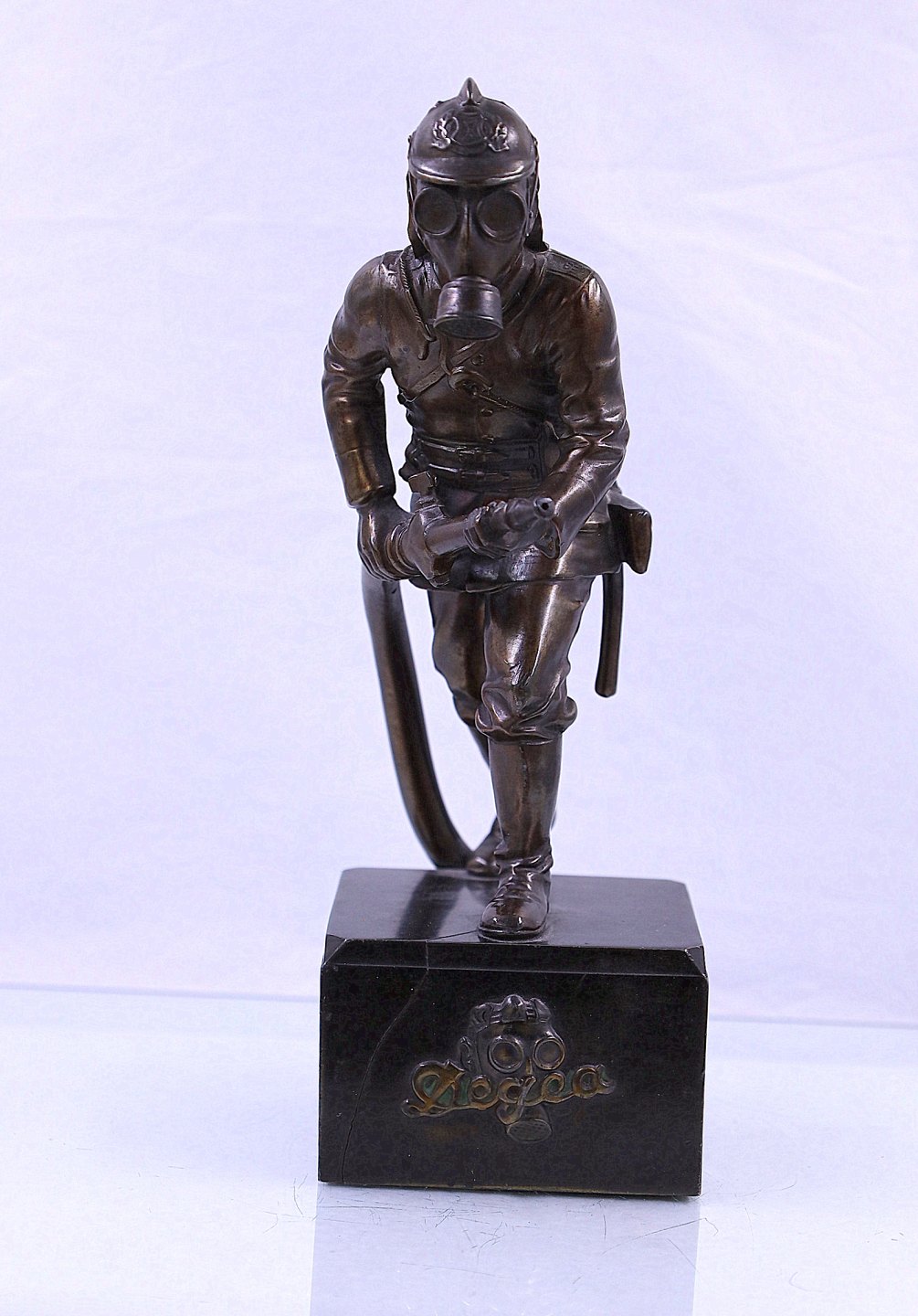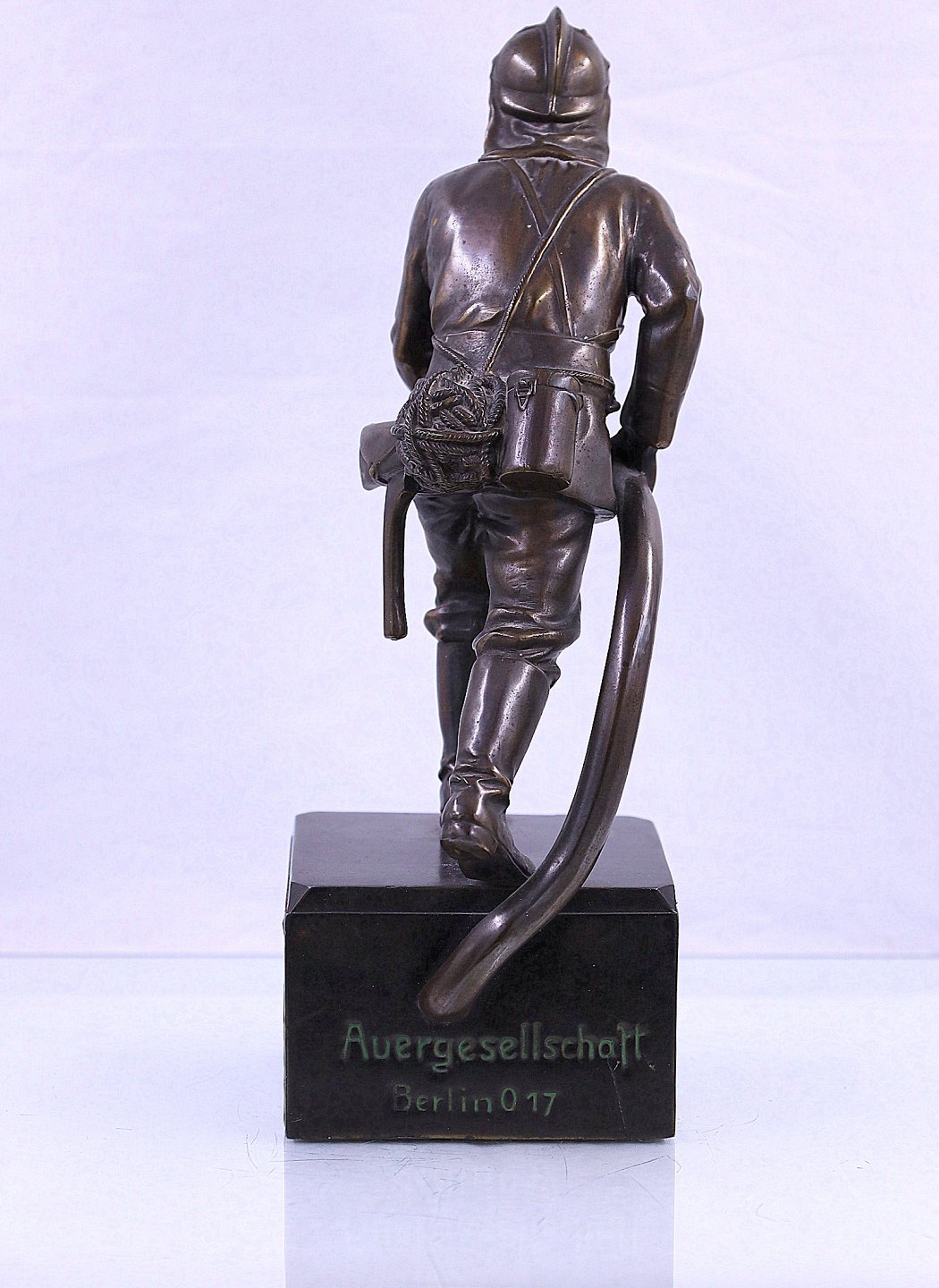 Brandmand i metal. Auergesellschaft var en Tysk industrivirksomhed, Auergesellschaft havde forskning og fremstilling indenfor gas og sjældne jordarter. Figuren forestiller en mand med fuld brandmandsudstyr. På foden af figuren står Decra, på den anden side står Auergesellschaft 017.