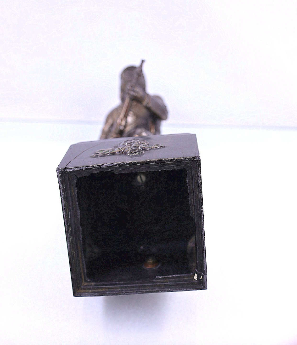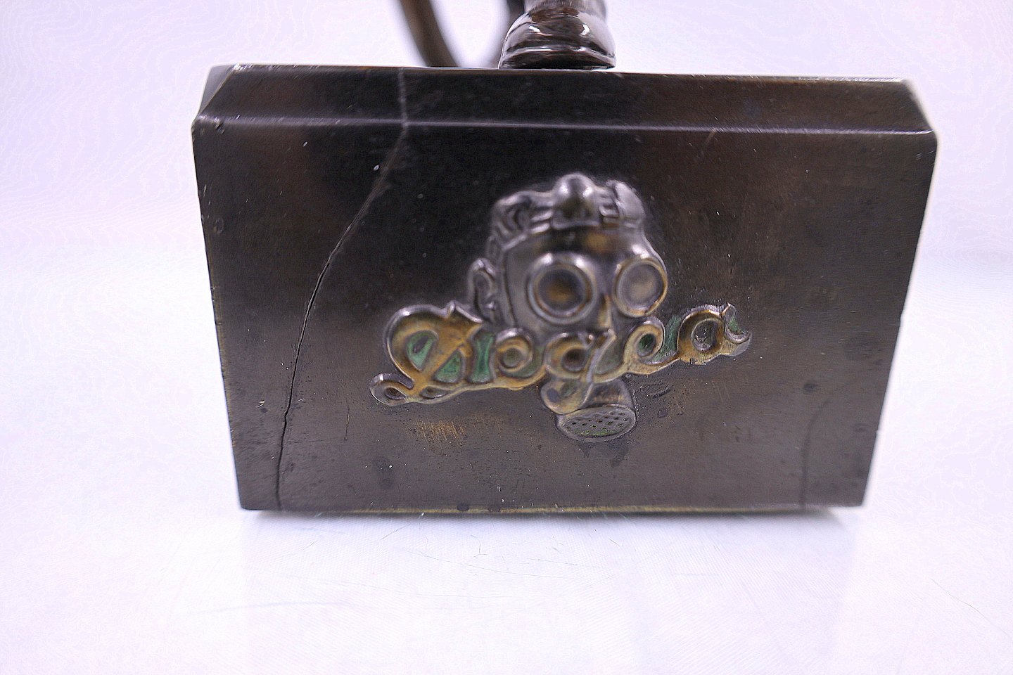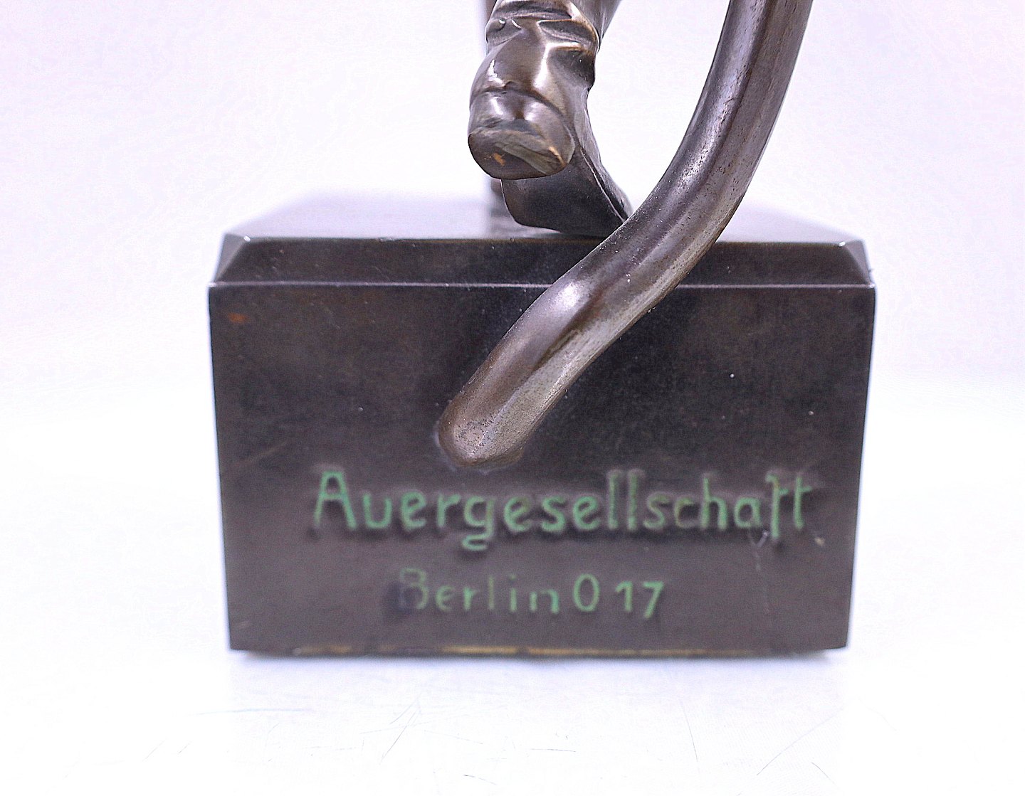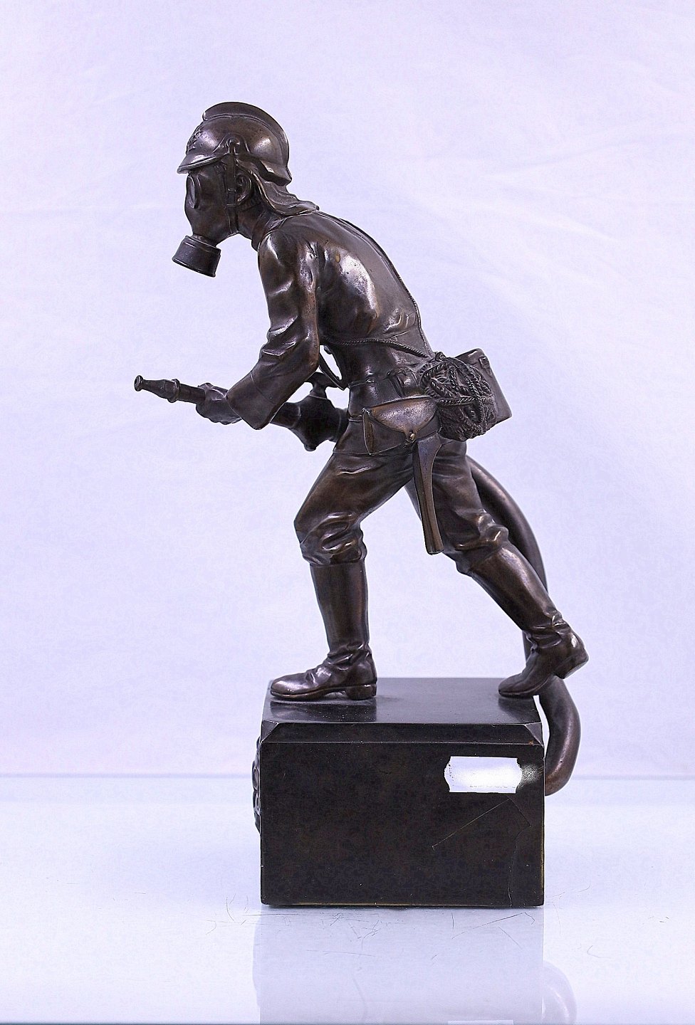 Brandmand i metal. Auergesellschaft var en Tysk industrivirksomhed, Auergesellschaft havde forskning og fremstilling indenfor gas og sjældne jordarter. Figuren forestiller en mand med fuld brandmandsudstyr. På foden af figuren står Decra, på den anden side står Auergesellschaft 017.