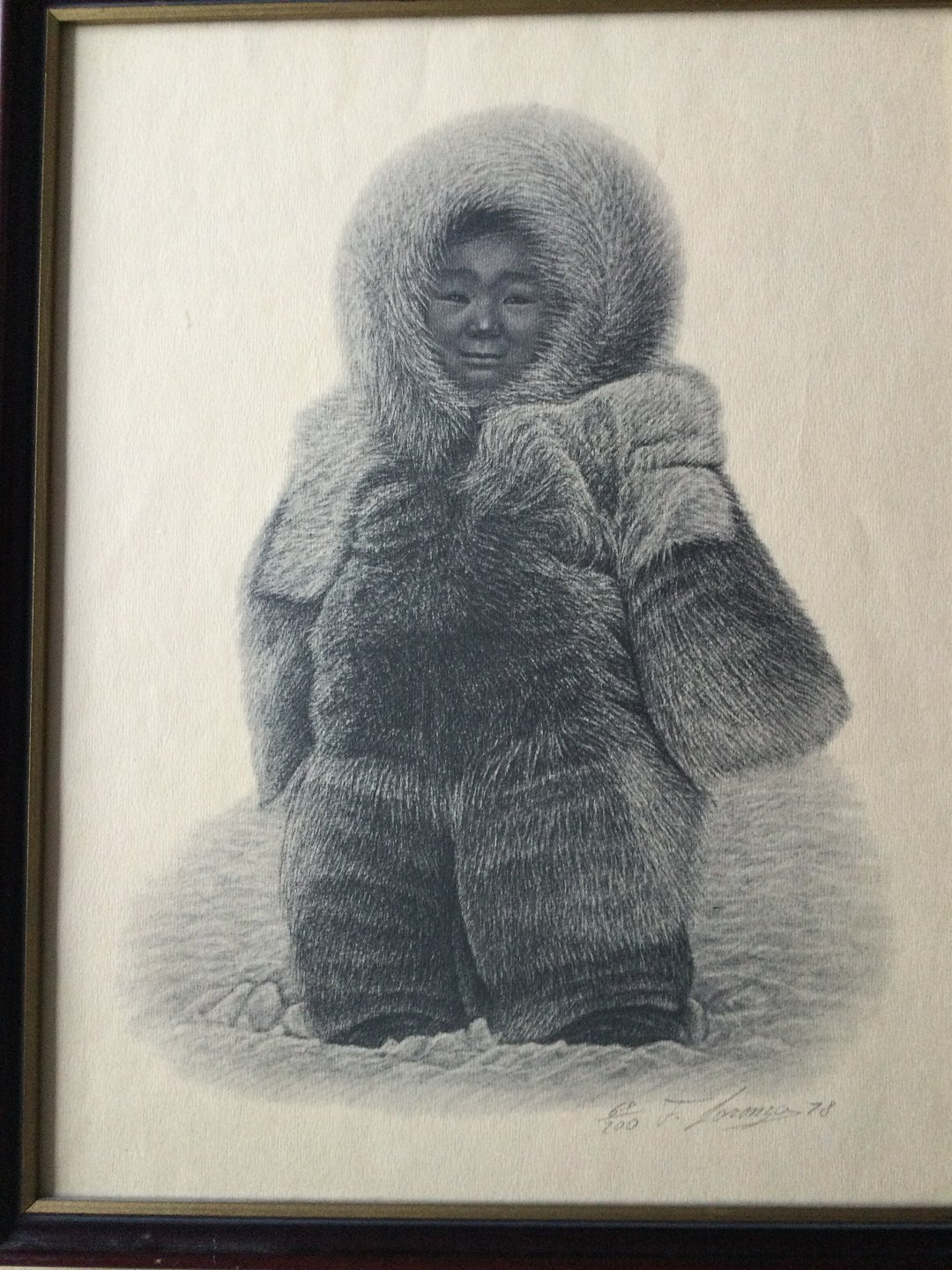 Litografi af Lorenzo Fracchetti 1978 Eskimo barn i parka pels.
